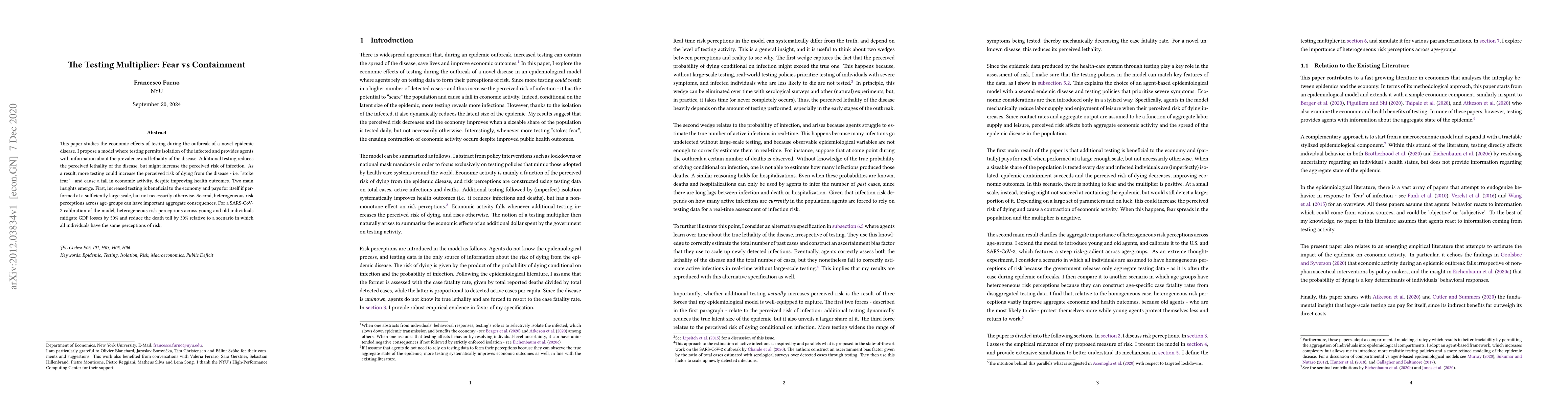 I study the economic effects of testing during the outbreak of a novel disease. I propose a model where testing permits isolation of the infected and provides agents with information about the prevalence and lethality of the disease. Additional testing reduces the perceived lethality of the disease, but might increase the perceived risk of infection. As a result, more testing could increase the perceived risk of dying from the disease - i.e. "stoke fear" - and cause a fall in economic activity, despite improving health outcomes. Two main insights emerge. First, increased testing is beneficial to the economy and pays for itself if performed at a sufficiently large scale, but not necessarily otherwise. Second, heterogeneous risk perceptions across age-groups can have important aggregate consequences. For a SARS-CoV-2 calibration of the model, heterogeneous risk perceptions across young and old individuals mitigate GDP losses by 50% and reduce the death toll by 30% relative to a scenario in which all individuals have the same perceptions of risk.