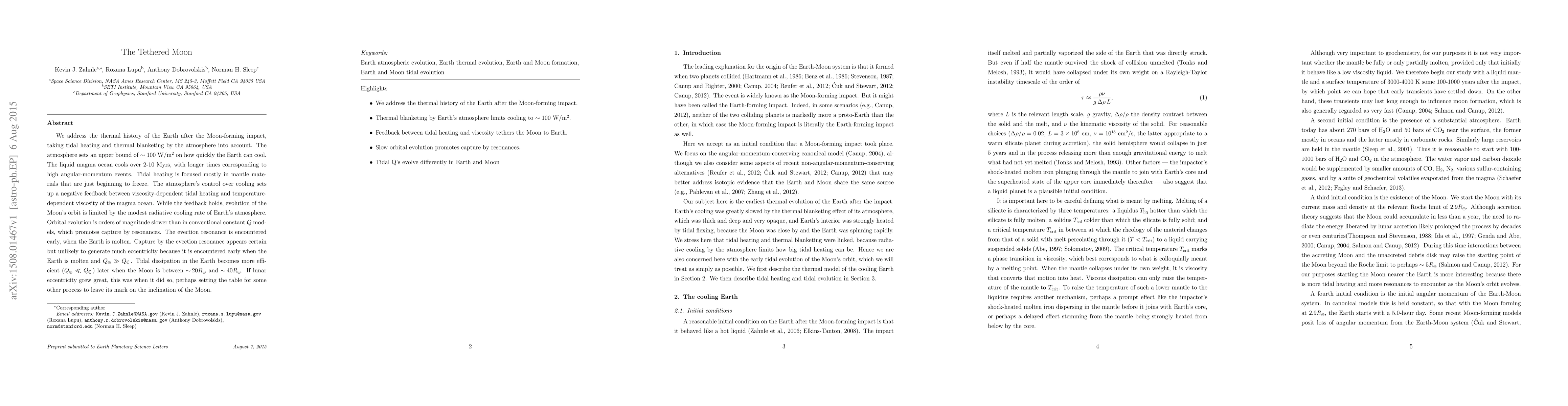 We address the thermal history of the Earth after the Moon-forming impact, taking tidal heating and thermal blanketing by the atmosphere into account. The atmosphere sets an upper bound of ~100 W/m^2 on how quickly the Earth can cool. The liquid magma ocean cools over 2-10 Myrs, with longer times corresponding to high angular-momentum events. Tidal heating is focused mostly in mantle materials that are just beginning to freeze. The atmosphere's control over cooling sets up a negative feedback between viscosity-dependent tidal heating and temperature-dependent viscosity of the magma ocean. While the feedback holds, evolution of the Moon's orbit is limited by the modest radiative cooling rate of Earth's atmosphere. Orbital evolution is orders of magnitude slower than in conventional constant Q models, which promotes capture by resonances. The evection resonance is encountered early, when the Earth is molten. Capture by the evection resonance appears certain but unlikely to generate much eccentricity because it is encountered early when the Earth is molten and Q_Earth >> Q_Moon. Tidal dissipation in the Earth becomes more efficient (Q_Earth << Q_Moon) later when the Moon is between ~20 R_Earth and ~40 R_Earth. If lunar eccentricity grew great, this was when it did so, perhaps setting the table for some other process to leave its mark on the inclination of the Moon.