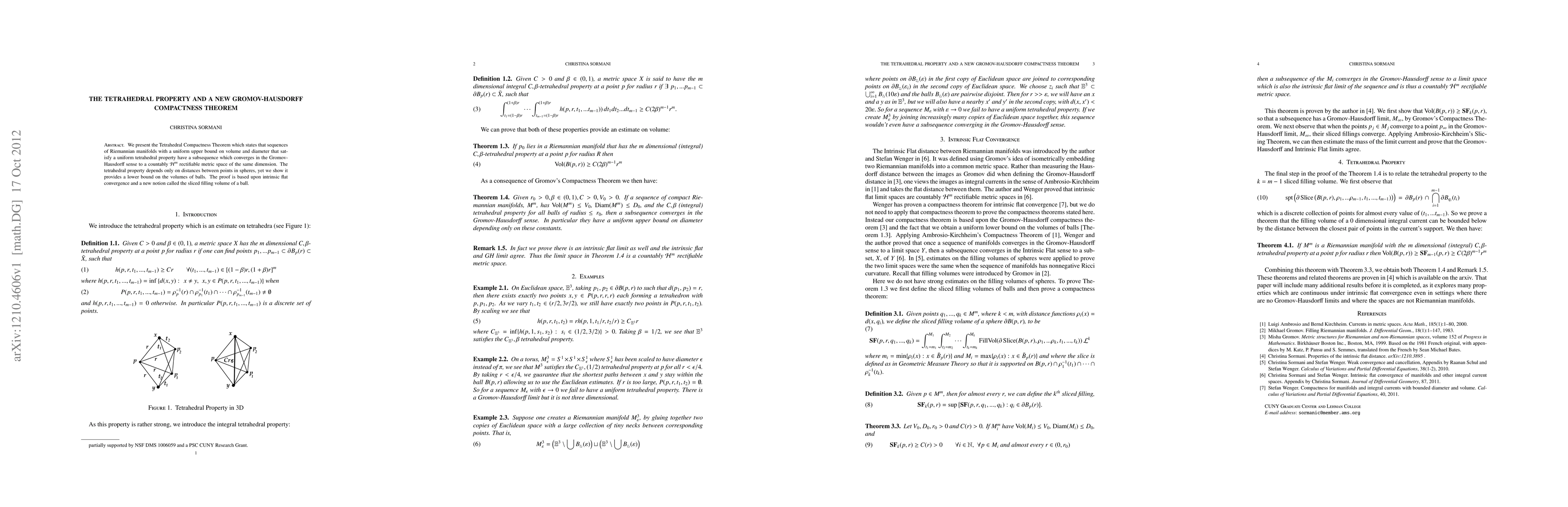 We present the Tetrahedral Compactness Theorem which states that sequences of Riemannian manifolds with a uniform upper bound on volume and diameter that satisfy a uniform tetrahedral property have a subsequence which converges in the Gromov-Hausdorff sense to a countably $\mathcal{H}^m$ rectifiable metric space of the same dimension. The tetrahedral property depends only on distances between points in spheres, yet we show it provides a lower bound on the volumes of balls. The proof is based upon intrinsic flat convergence and a new notion called the sliced filling volume of a ball.