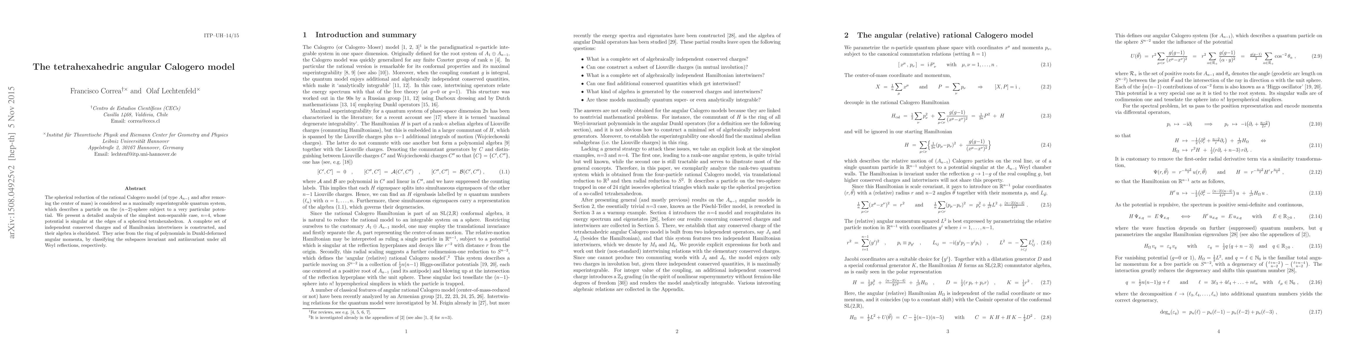 The tetrahexahedric angular Calogero model is a quantum system that describes a particle on the 2-sphere with a unique potential, featuring a complete set of conserved charges and Hamiltonian intertwiners.