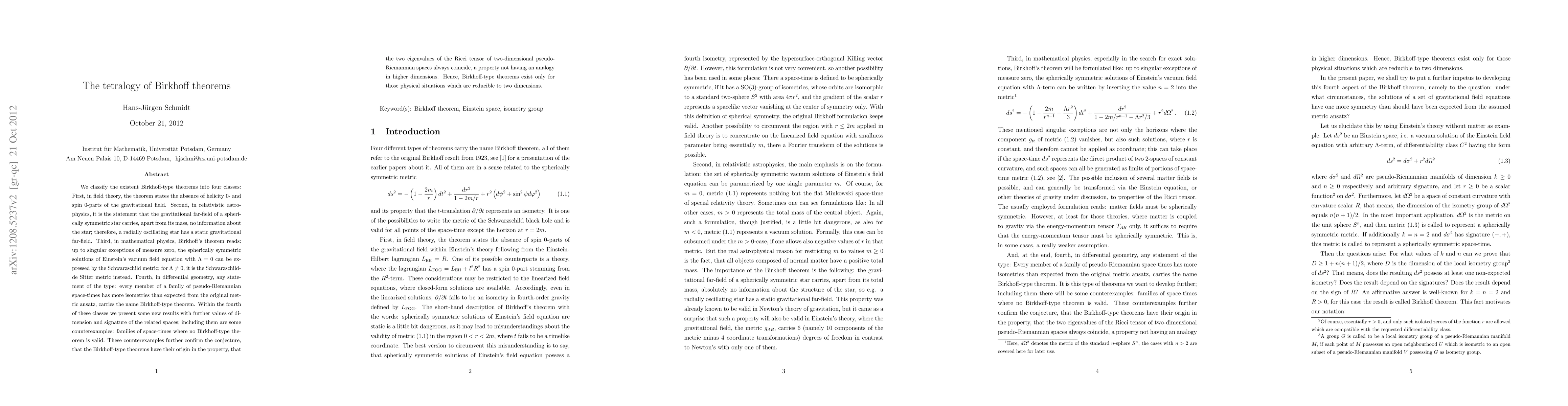 We classify the existent Birkhoff-type theorems into four classes: First, in field theory, the theorem states the absence of helicity 0- and spin 0-parts of the gravitational field. Second, in relativistic astrophysics, it is the statement that the gravitational far-field of a spherically symmetric star carries, apart from its mass, no information about the star; therefore, a radially oscillating star has a static gravitational far-field. Third, in mathematical physics, Birkhoff's theorem reads: up to singular exceptions of measure zero, the spherically symmetric solutions of Einstein's vacuum field equation with Lambda = 0 can be expressed by the Schwarzschild metric; for Lambda unequal 0, it is the Schwarzschild-de Sitter metric instead. Fourth, in differential geometry, any statement of the type: every member of a family of pseudo-Riemannian space-times has more isometries than expected from the original metric ansatz, carries the name Birkhoff-type theorem. Within the fourth of these classes we present some new results with further values of dimension and signature of the related spaces; including them are some counterexamples: families of space-times where no Birkhoff-type theorem is valid. These counterexamples further confirm the conjecture, that the Birkhoff-type theorems have their origin in the property, that the two eigenvalues of the Ricci tensor of two-dimensional pseudo-Riemannian spaces always coincide, a property not having an analogy in higher dimensions. Hence, Birkhoff-type theorems exist only for those physical situations which are reducible to two dimensions.