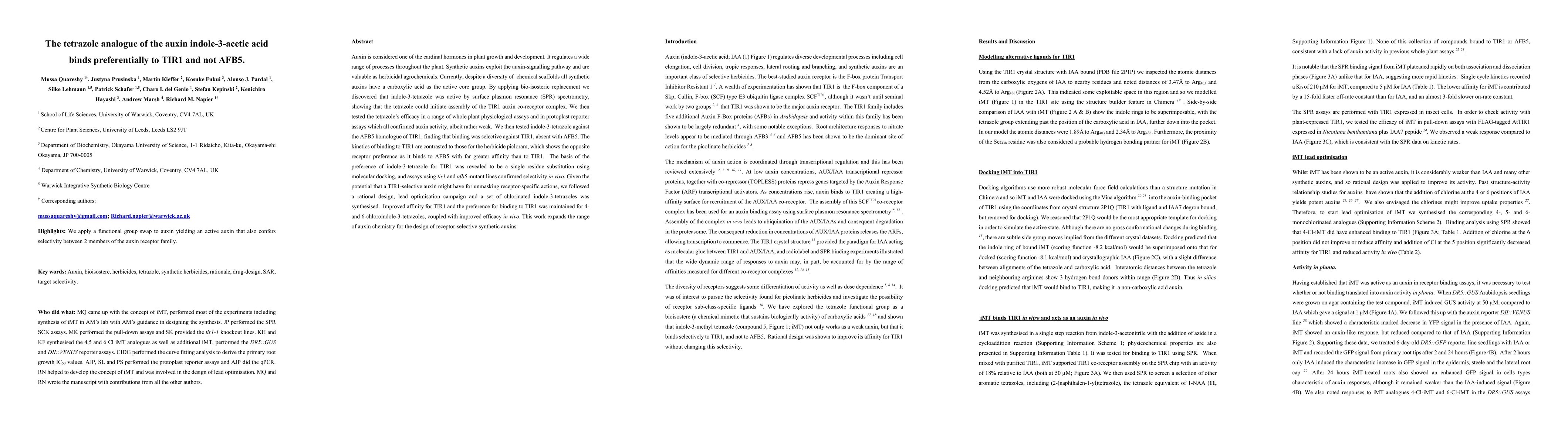 Auxin is considered one of the cardinal hormones in plant growth and development. It regulates a wide range of processes throughout the plant. Synthetic auxins exploit the auxin-signalling pathway and are valuable as herbicidal agrochemicals. Currently, despite a diversity of chemical scaffolds all synthetic auxins have a carboxylic acid as the active core group. By applying bio-isosteric replacement we discovered that indole-3-tetrazole was active by surface plasmon resonance (SPR) spectrometry, showing that the tetrazole could initiate assembly of the TIR1 auxin co-receptor complex. We then tested the tetrazole's efficacy in a range of whole plant physiological assays and in protoplast reporter assays which all confirmed auxin activity, albeit rather weak. We then tested indole-3-tetrazole against the AFB5 homologue of TIR1, finding that binding was selective against TIR1, absent with AFB5. The kinetics of binding to TIR1 are contrasted to those for the herbicide picloram, which shows the opposite receptor preference as it binds to AFB5 with far greater affinity than to TIR1. The basis of the preference of indole-3-tetrazole for TIR1 was revealed to be a single residue substitution using molecular docking, and assays using tir1 and afb5 mutant lines confirmed selectivity in vivo. Given the potential that a TIR1-selective auxin might have for unmasking receptor-specific actions, we followed a rational design, lead optimisation campaign and a set of chlorinated indole-3-tetrazoles was synthesised. Improved affinity for TIR1 and the preference for binding to TIR1 was maintained for 4- and 6-chloroindole-3-tetrazoles, coupled with improved efficacy in vivo. This work expands the range of auxin chemistry for the design of receptor-selective synthetic auxins.