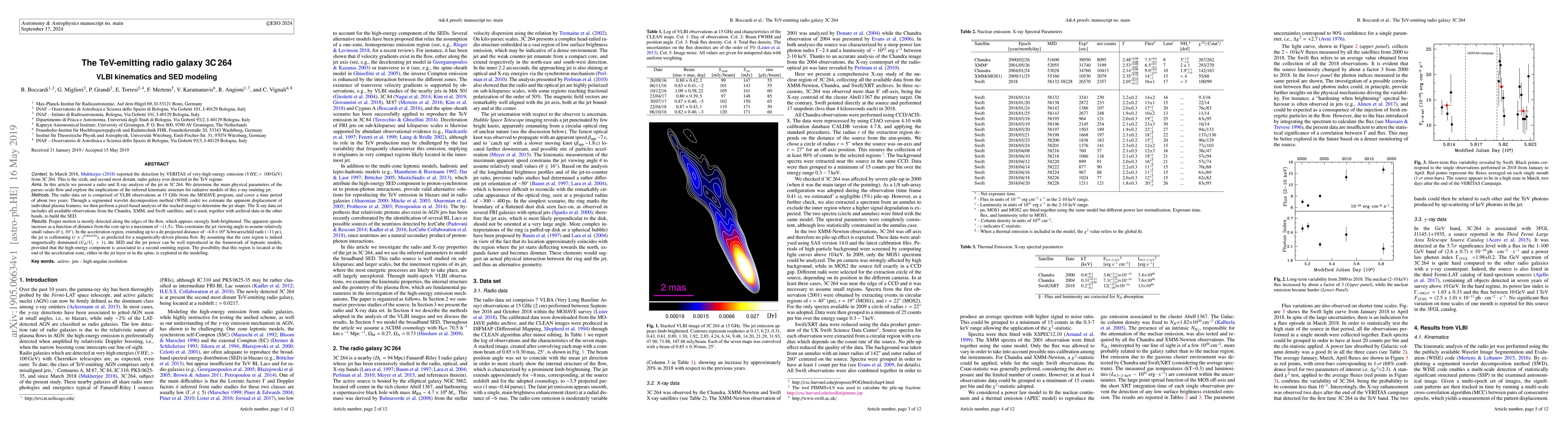 This paper analyzes the TeV-emitting radio galaxy 3C 264 using VLBI kinematics and SED modeling to determine the jet's physical parameters and kinematic structure. The study shows that the jet exhibits strong limb brightening and apparent speeds up to 11.5 times the speed of light, constraining the viewing angle to be small. The jet's collimation and acceleration region are consistent with magnetically-driven plasma flow, and the SED can be well reproduced by leptonic models, suggesting a second emitting region for the high-energy component.