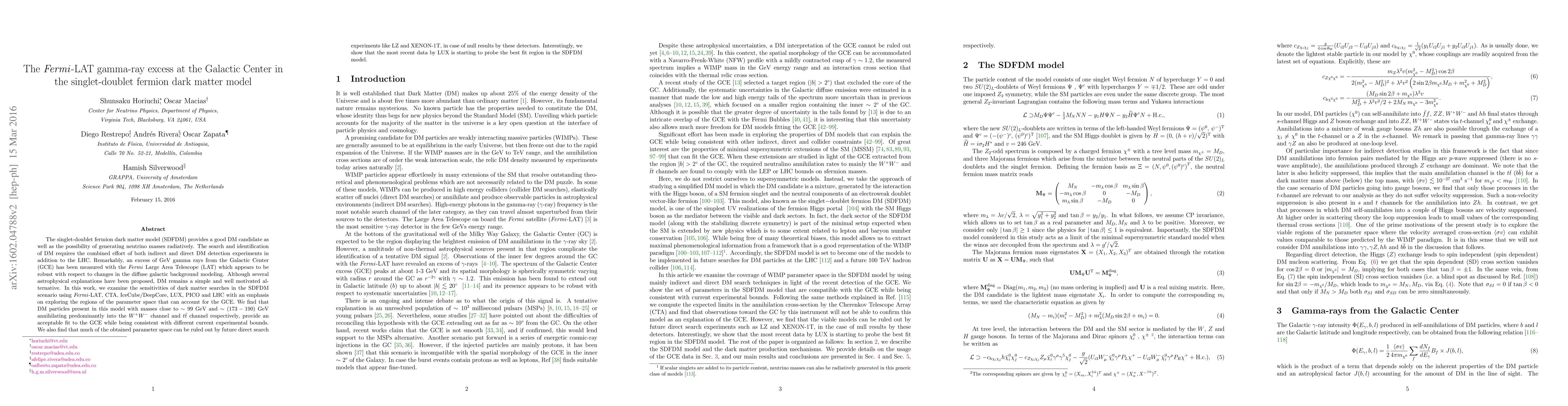The singlet-doublet fermion dark matter model (SDFDM) provides a good DM candidate as well as the possibility of generating neutrino masses radiatively. The search and identification of DM requires the combined effort of both indirect and direct DM detection experiments in addition to the LHC. Remarkably, an excess of GeV gamma rays from the Galactic Center (GCE) has been measured with the \textit{Fermi} Large Area Telescope (LAT) which appears to be robust with respect to changes in the diffuse galactic background modeling. Although several astrophysical explanations have been proposed, DM remains a simple and well motivated alternative. In this work, we examine the sensitivities of dark matter searches in the SDFDM scenario using $\textit{Fermi}$-LAT, CTA, IceCube/DeepCore, LUX, PICO and LHC with an emphasis on exploring the regions of the parameter space that can account for the GCE. We find that DM particles present in this model with masses close to $\sim 99$ GeV and $\sim (173-190)$ GeV annihilating predominantly into the $W^+W^-$ channel and $t\bar{t}$ channel respectively, provide an acceptable fit to the GCE while being consistent with different current experimental bounds. We also find that much of the obtained parameter space can be ruled out by future direct search experiments like LZ and XENON-1T, in case of null results by these detectors. Interestingly, we show that the most recent data by LUX is starting to probe the best fit region in the SDFDM model.