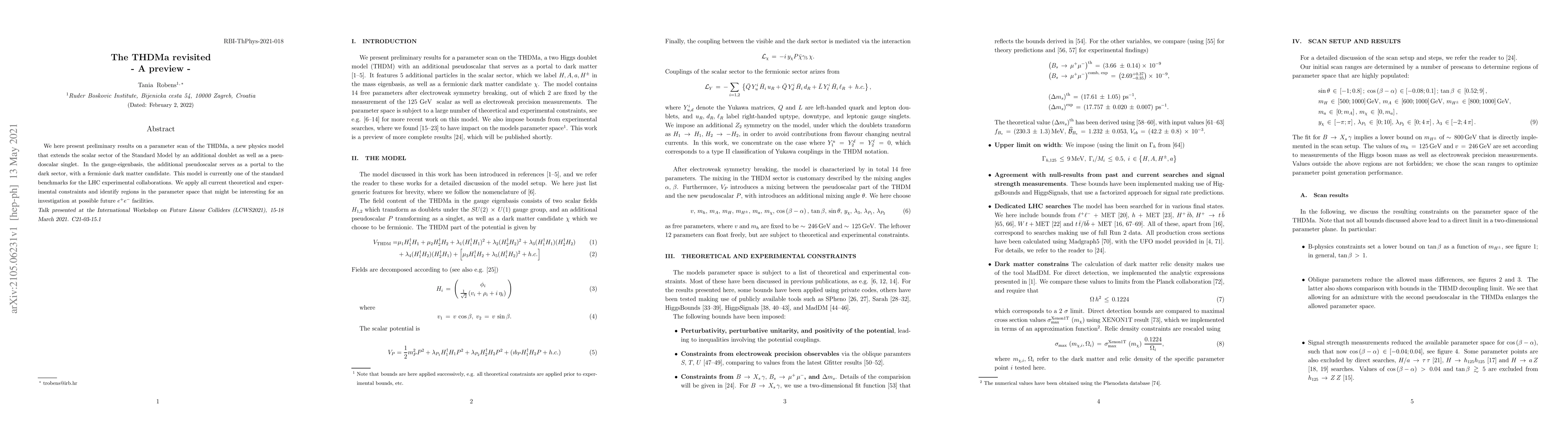 We here present preliminary results on a parameter scan of the THDMa, a new physics model that extends the scalar sector of the Standard Model by an additional doublet as well as a pseudoscalar singlet. In the gauge-eigenbasis, the additional pseudoscalar serves as a portal to the dark sector, with a fermionic dark matter candidate. This model is currently one of the standard benchmarks for the LHC experimental collaborations. We apply all current theoretical and experimental constraints and identify regions in the parameter space that might be interesting for an investigation at possible future $e^+e^-$ facilities.