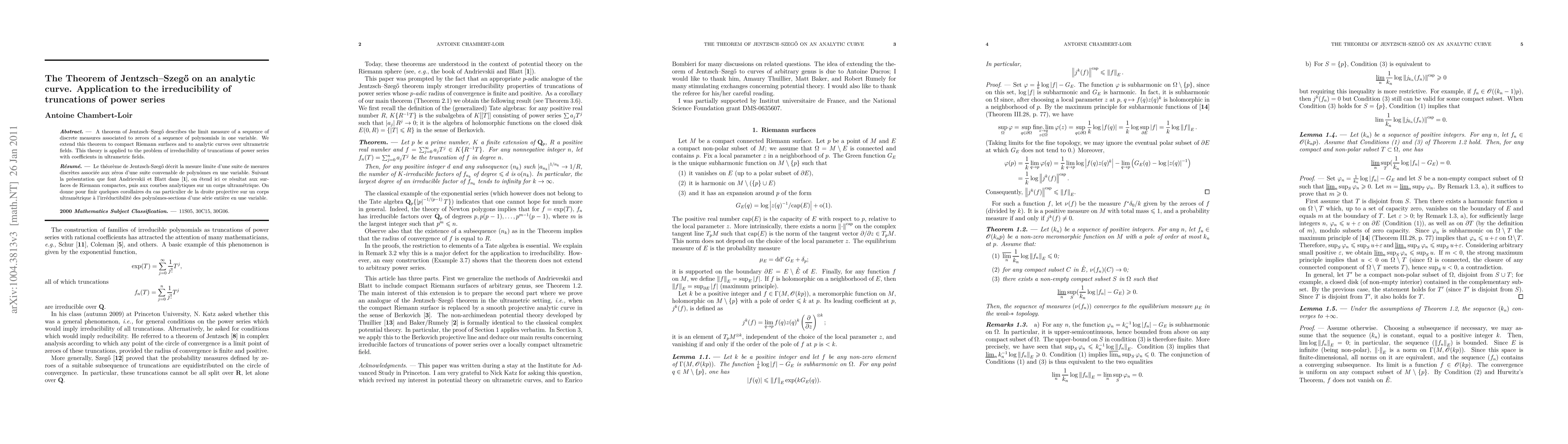 The theorem of Jentzsch--Szeg\H{o} describes the limit measure of a sequence of discrete measures associated to the zeroes of a sequence of polynomials in one variable. Following the presentation of this result by Andrievskii and Blatt in their book, we extend this theorem to compact Riemann surfaces, then to analytic curves over an ultrametric field. The particular case of the projective line over an ultrametric field gives as corollaries information about the irreducibility of the truncations of a power series in one variable.