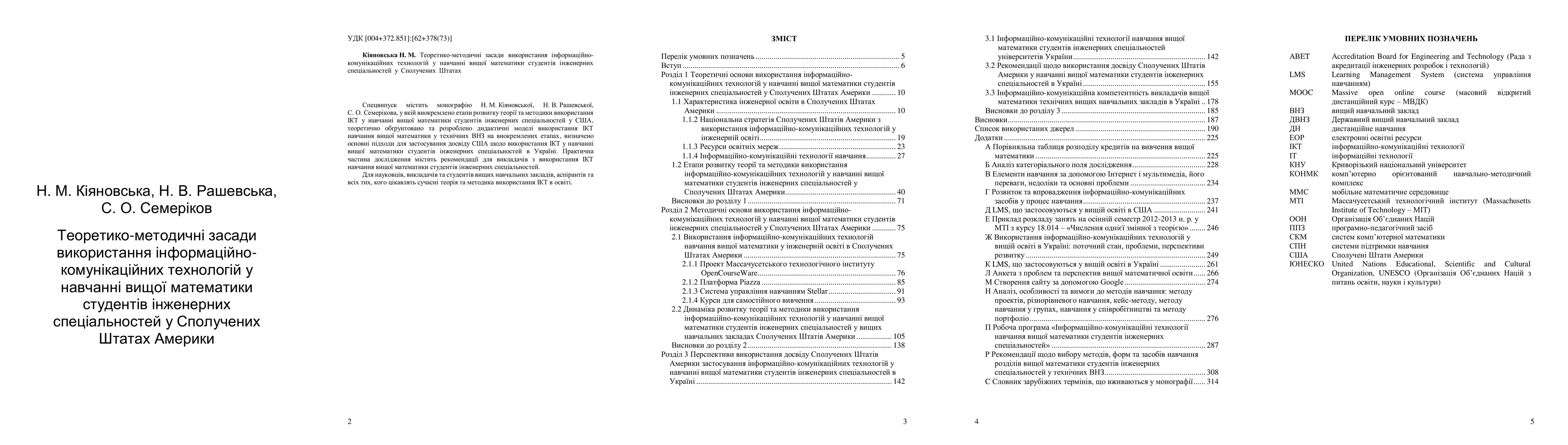 Monograph is singled out stages of the theory and methods of using ICT in teaching higher mathematics engineering students in the United States, theoretically grounded and developed educational models of ICT using while learning higher mathematics at engineering universities in the examined stages, the main approaches to apply the US experience on the use of ICT in learning higher mathematics engineering students in Ukraine are revised. The practical part of the study provides guidance for teachers on the use of ICT learning higher mathematics engineering students. For researchers, teachers and university students, graduate students and all those interested in contemporary theory and methods of use of ICT in education.