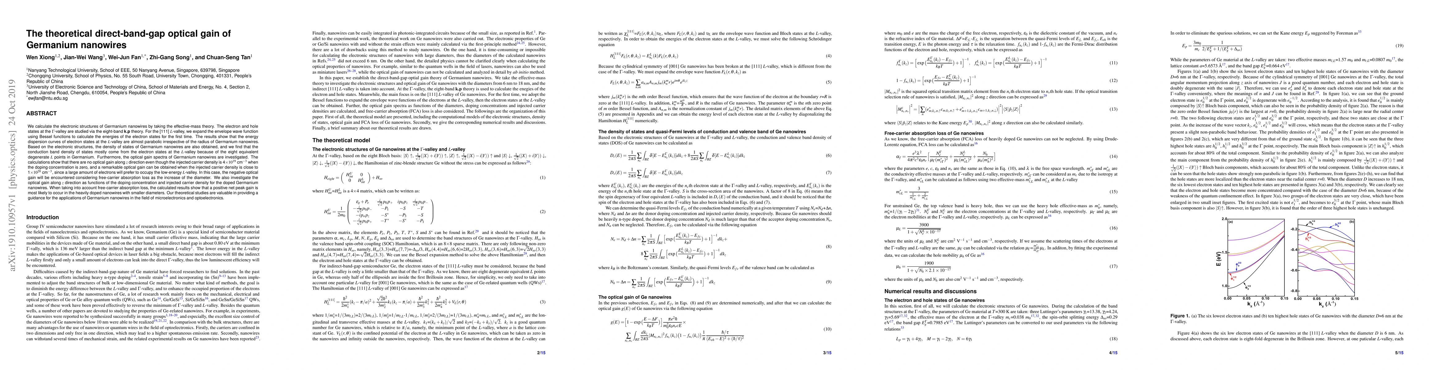 This paper investigates the electronic structure and optical gain of Germanium nanowires using effective-mass theory and k.p methods, revealing significant optical gain potential in heavily doped, small-diameter nanowires despite free-carrier absorption losses. The study provides theoretical insights for the application of Germanium nanowires in microelectronics and optoelectronics.