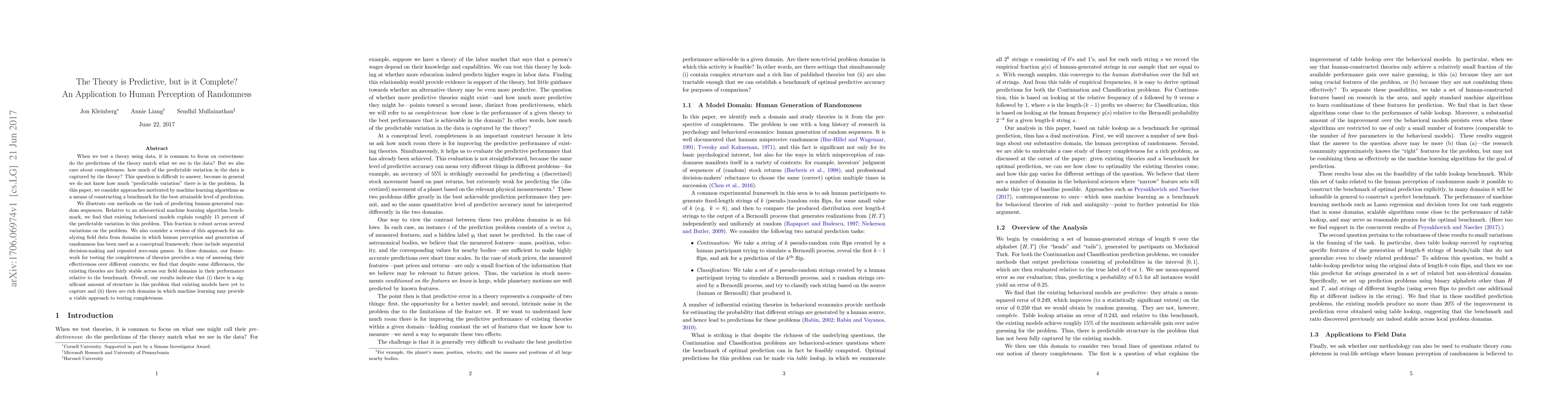 When we test a theory using data, it is common to focus on correctness: do the predictions of the theory match what we see in the data? But we also care about completeness: how much of the predictable variation in the data is captured by the theory? This question is difficult to answer, because in general we do not know how much "predictable variation" there is in the problem. In this paper, we consider approaches motivated by machine learning algorithms as a means of constructing a benchmark for the best attainable level of prediction. We illustrate our methods on the task of predicting human-generated random sequences. Relative to an atheoretical machine learning algorithm benchmark, we find that existing behavioral models explain roughly 15 percent of the predictable variation in this problem. This fraction is robust across several variations on the problem. We also consider a version of this approach for analyzing field data from domains in which human perception and generation of randomness has been used as a conceptual framework; these include sequential decision-making and repeated zero-sum games. In these domains, our framework for testing the completeness of theories provides a way of assessing their effectiveness over different contexts; we find that despite some differences, the existing theories are fairly stable across our field domains in their performance relative to the benchmark. Overall, our results indicate that (i) there is a significant amount of structure in this problem that existing models have yet to capture and (ii) there are rich domains in which machine learning may provide a viable approach to testing completeness.