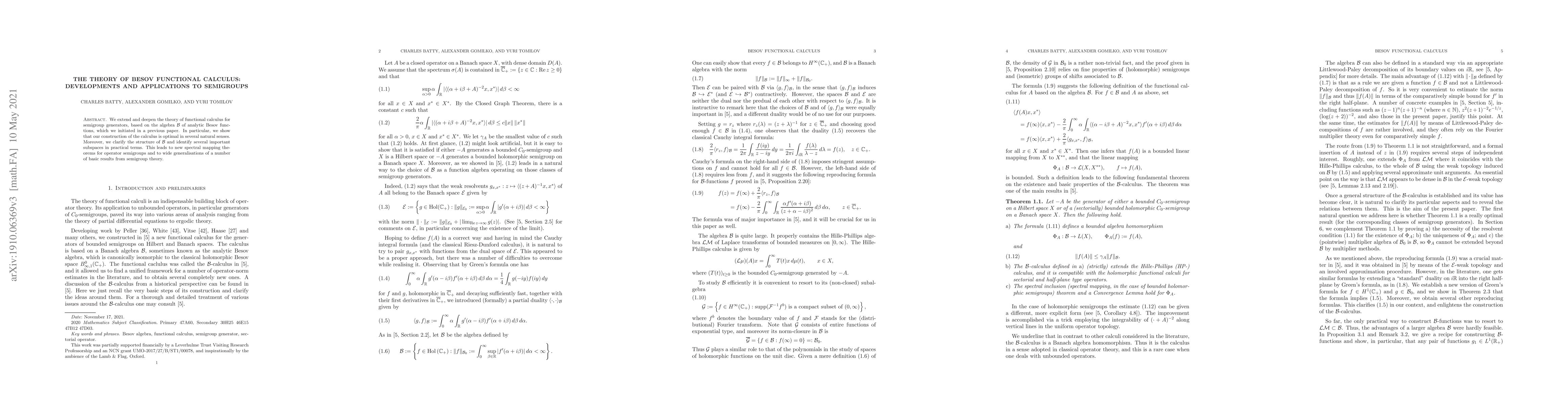 The paper extends the functional calculus for semigroup generators using the algebra of analytic Besov functions, demonstrating optimal construction and identifying significant subspaces, which leads to new spectral theorems and generalizations in semigroup theory.