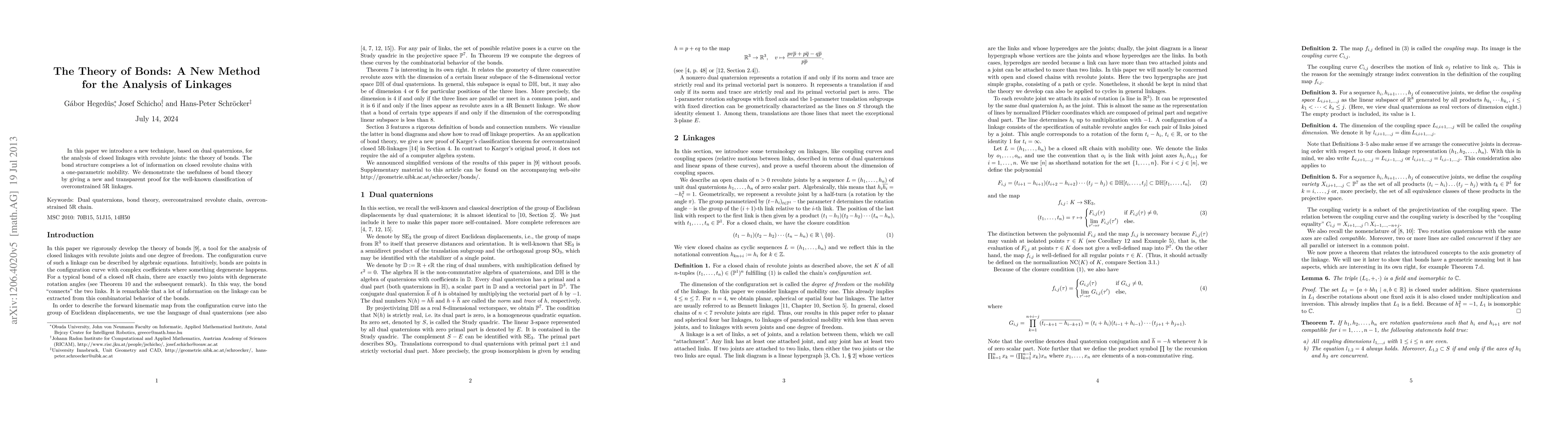 In this paper we introduce a new technique, based on dual quaternions, for the analysis of closed linkages with revolute joints: the theory of bonds. The bond structure comprises a lot of information on closed revolute chains with a one-parametric mobility. We demonstrate the usefulness of bond theory by giving a new and transparent proof for the well-known classification of overconstrained 5R linkages.