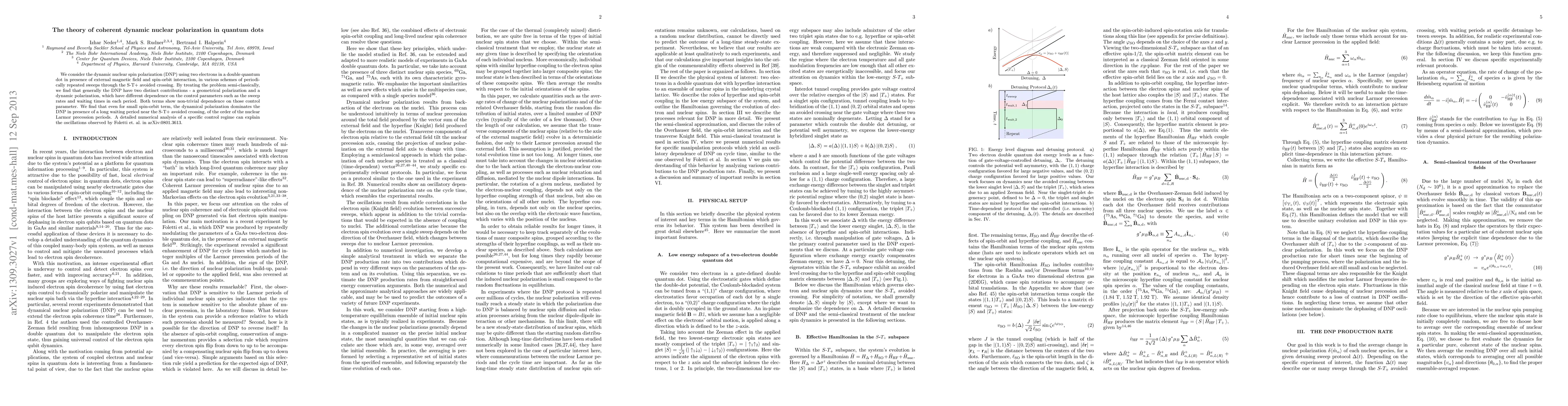 This paper explores coherent dynamic nuclear polarization (DNP) in quantum dots using two electrons, revealing two distinct DNP contributions: geometrical and dynamic polarization. The study finds that dynamic polarization dominates under long waiting periods near the S-T+ avoided crossing, explaining observed oscillations in specific control regimes.