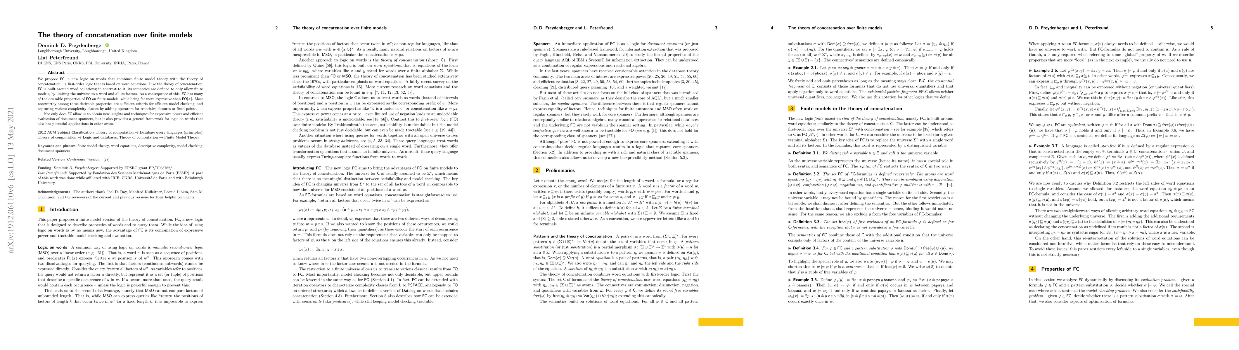We propose FC, a new logic on words that combines finite model theory with the theory of concatenation - a first-order logic that is based on word equations. Like the theory of concatenation, FC is built around word equations; in contrast to it, its semantics are defined to only allow finite models, by limiting the universe to a word and all its factors. As a consequence of this, FC has many of the desirable properties of FO on finite models, while being far more expressive than FO[<]. Most noteworthy among these desirable properties are sufficient criteria for efficient model checking, and capturing various complexity classes by adding operators for transitive closures or fixed points. Not only does FC allow us to obtain new insights and techniques for expressive power and efficient evaluation of document spanners, but it also provides a general framework for logic on words that also has potential applications in other areas.