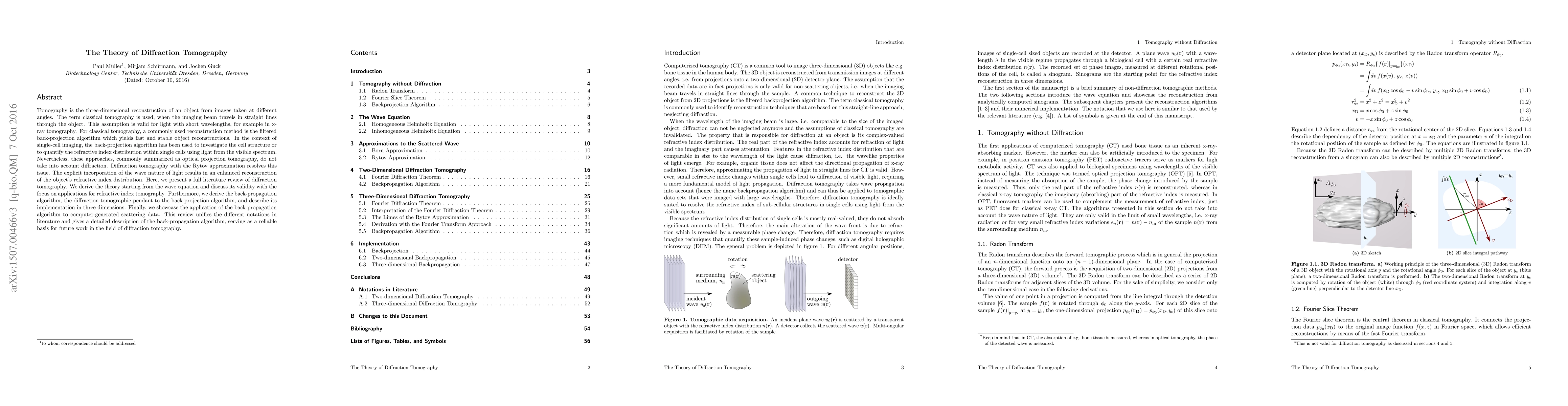 This paper reviews diffraction tomography, a method that incorporates the wave nature of light for enhanced three-dimensional reconstruction of objects, particularly for refractive index tomography. It derives the theory from the wave equation and presents the back-propagation algorithm as an alternative to the filtered back-projection method, demonstrating its application to computer-generated scattering data.