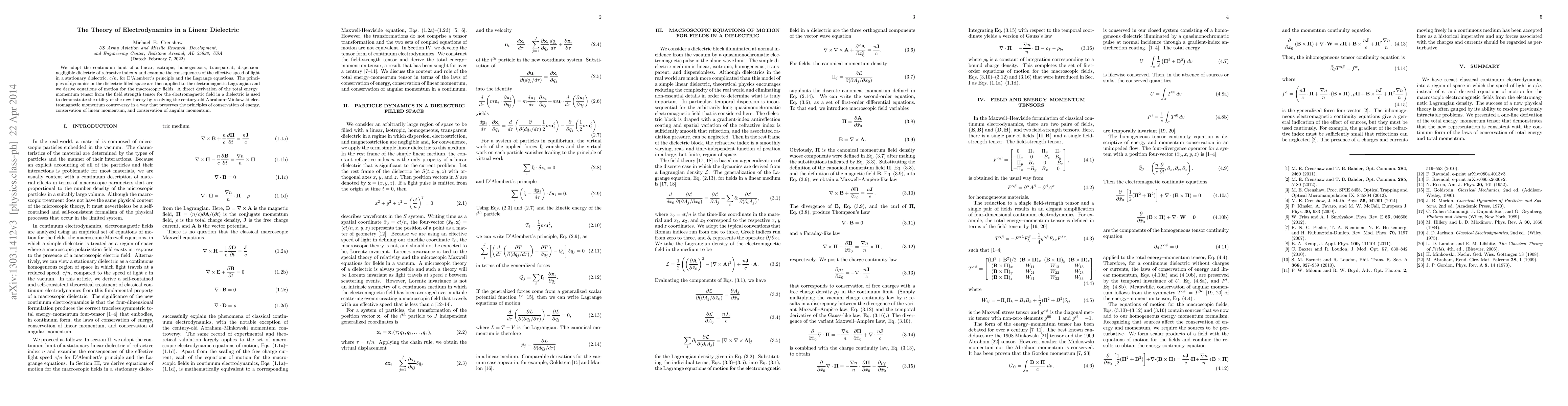 We adopt the continuum limit of a linear, isotropic, homogeneous, transparent, dispersion-negligible dielectric of refractive index $n$ and examine the consequences of the effective speed of light in a stationary dielectric, $c/n$, for D'Alembert's principle and the Lagrange equations. The principles of dynamics in the dielectric-filled space are then applied to the electromagnetic Lagrangian and we derive equations of motion for the macroscopic fields. A direct derivation of the total energy--momentum tensor from the field strength tensor for the electromagnetic field in a dielectric is used to demonstrate the utility of the new theory by resolving the century-old Abraham--Minkowski electromagnetic momentum controversy in a way that preserves the principles of conservation of energy, conservation of linear momentum, and conservation of angular momentum.