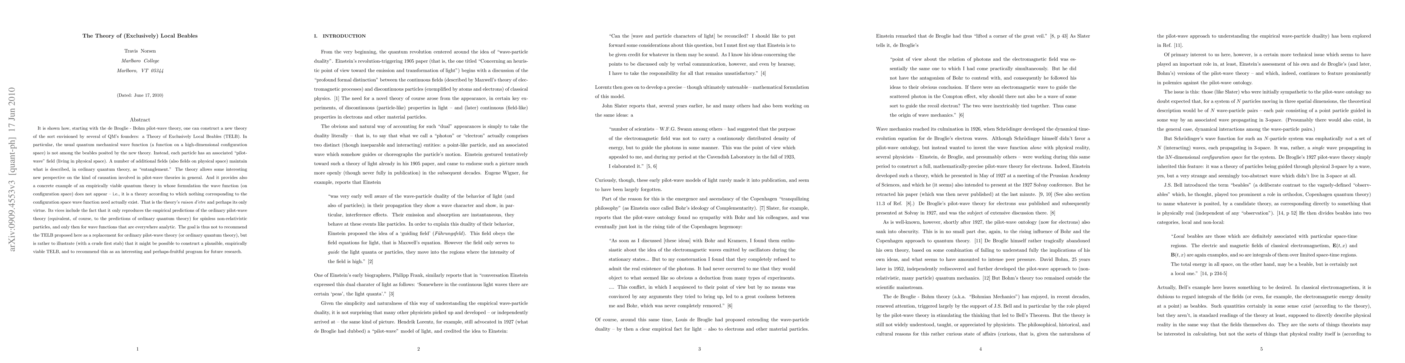 This paper proposes a new Theory of Exclusively Local Beables (TELB) derived from de Broglie-Bohm pilot-wave theory, which eliminates the quantum mechanical wave function in favor of local fields. While it reproduces the predictions of ordinary quantum theory for certain conditions, its main value is as a conceptual illustration of a possible alternative framework.