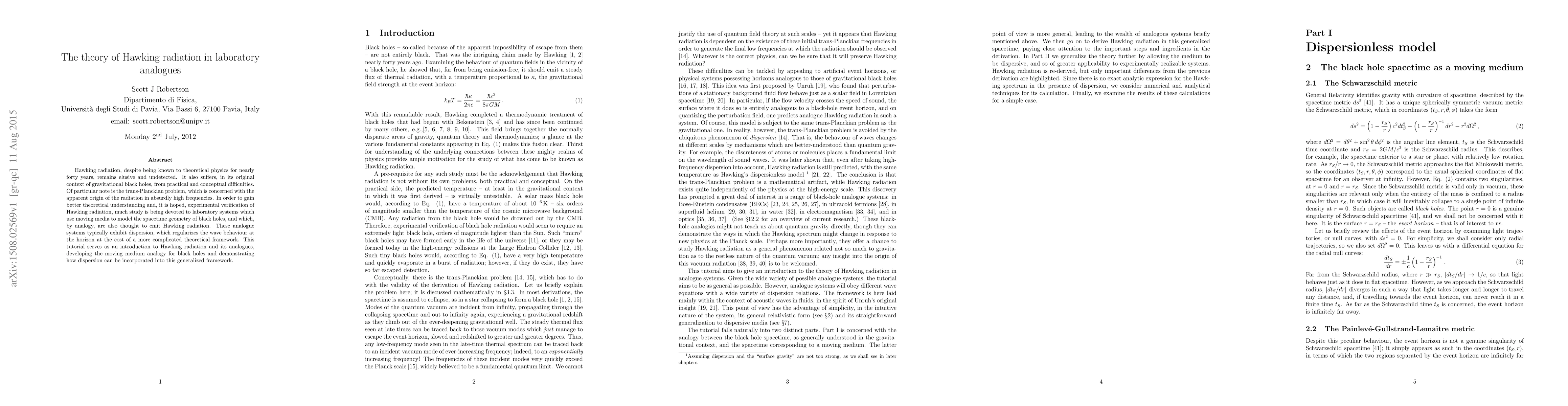 This paper provides an introduction to Hawking radiation and explores laboratory analogues using moving media to model black hole spacetime geometry. It discusses how dispersion in these analogue systems can address the trans-Planckian problem and offers a generalized framework for understanding the wave behavior near the horizon.