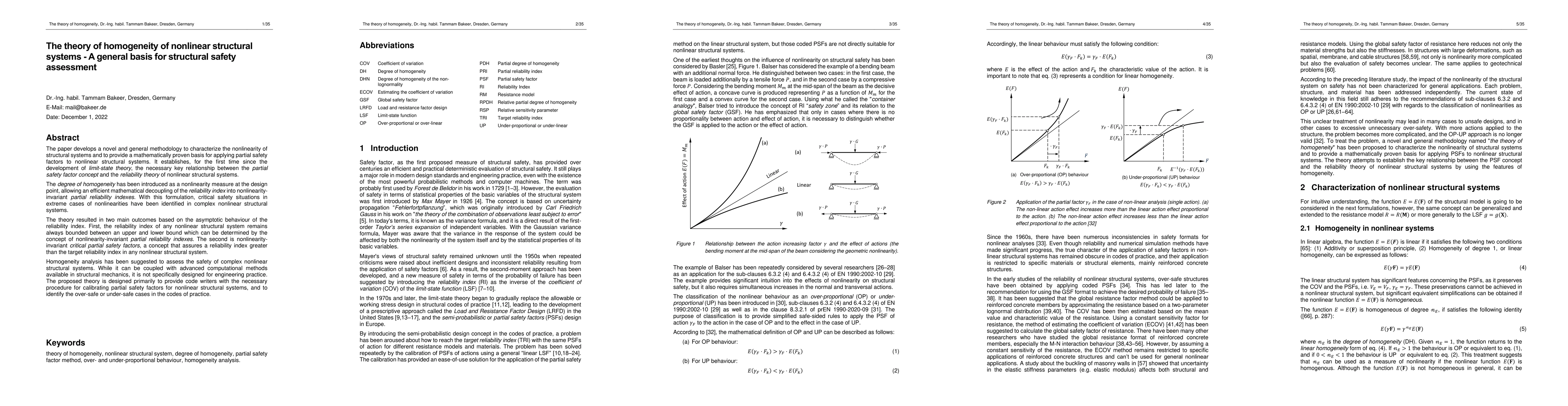 The paper develops a novel and general methodology to characterize the nonlinearity of structural systems and to provide a mathematically proven basis for applying partial safety factors to nonlinear structural systems. It establishes, for the first time since the development of limit-state theory, the necessary key relationship between the partial safety factor concept and the reliability theory of nonlinear structural systems. The degree of homogeneity has been introduced as a nonlinearity measure at the design point, allowing an efficient mathematical decoupling of the reliability index into nonlinearity-invariant partial reliability indexes. With this formulation, critical safety situations in extreme cases of nonlinearities have been identified in complex nonlinear structural systems. The theory resulted in two main outcomes based on the asymptotic behaviour of the reliability index. First, the reliability index of any nonlinear structural system remains always bounded between an upper and lower bound, which can be determined by the concept of nonlinearity-invariant partial reliability indexes. The second is nonlinearity-invariant critical partial safety factors, a concept that assures a reliability index greater than the target reliability index in any nonlinear structural system. Homogeneity analysis has been suggested to assess the safety of complex nonlinear structural systems. While it can be coupled with advanced computational methods available in structural mechanics, it is not specifically designed for engineering practice. The proposed theory is designed primarily to provide code writers with the necessary procedure for calibrating partial safety factors for nonlinear structural systems, and to identify the over-safe or under-safe cases in the codes of practice.
