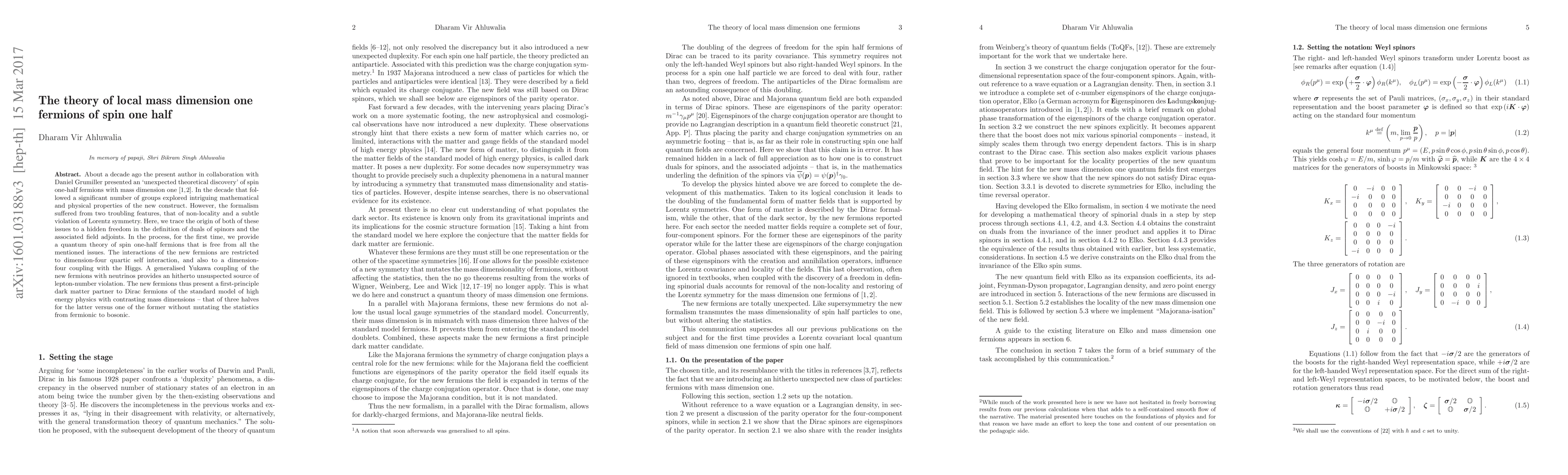 About a decade ago the present author in collaboration with Daniel Grumiller presented an `unexpected theoretical discovery' of spin one-half fermions with mass dimension one [JCAP 2005, PRD 2005]. In the decade that followed a significant number of groups explored intriguing mathematical and physical properties of the new construct. However, the formalism suffered from two troubling features, that of non-locality and a subtle violation of Lorentz symmetry. Here, we trace the origin of both of these issues to a hidden freedom in the definition of duals of spinors and the associated field adjoints. In the process, for the first time, we provide a quantum theory of spin one-half fermions that is free from all the mentioned issues. The interactions of the new fermions are restricted to dimension-four quartic self interaction, and also to a dimension-four coupling with the Higgs. A generalised Yukawa coupling of the new fermions with neutrinos provides an hitherto unsuspected source of lepton-number violation. The new fermions thus present a first-principle dark matter partner to Dirac fermions of the standard model of high energy physics with contrasting mass dimensions -- that of three halves for the latter versus one of the former without mutating the statistics from fermionic to bosonic.