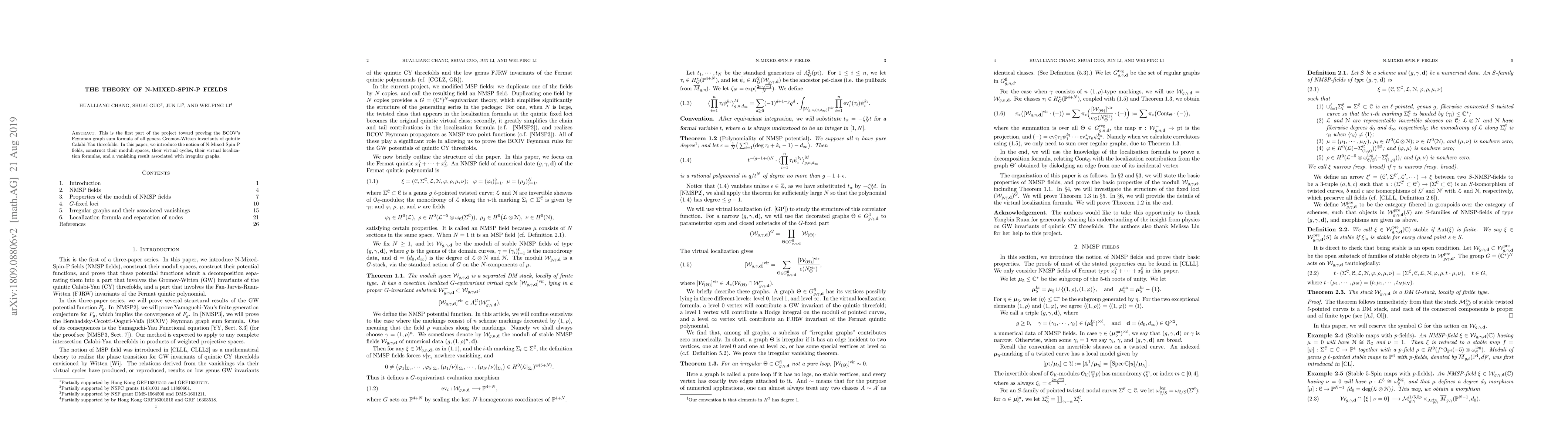 This is the first part of the project toward proving the BCOV's Feymann graph sum formula of all genera Gromov-Witten invariants of quintic Calabi-Yau threefolds. In this paper, we introduce the notion of N-Mixed-Spin-P fields, construct their moduli spaces, their virtual cycles, their virtual localization formulas, and a vanishing result associated with irregular graphs.