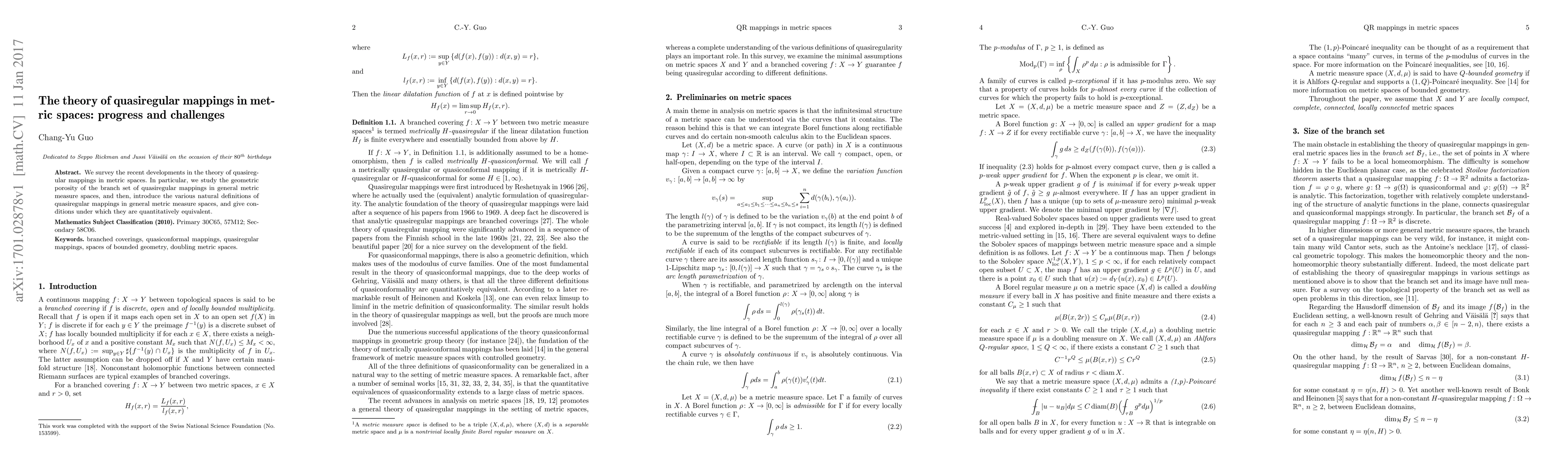 We survey the recent developments in the theory of quasireg- ular mappings in metric spaces. In particular, we study the geometric porosity of the branch set of quasiregular mappings in general metric measure spaces, and then, introduce the various natural definitions of quasiregular mappings in general metric measure spaces, and give con- ditions under which they are quantitatively equivalent.