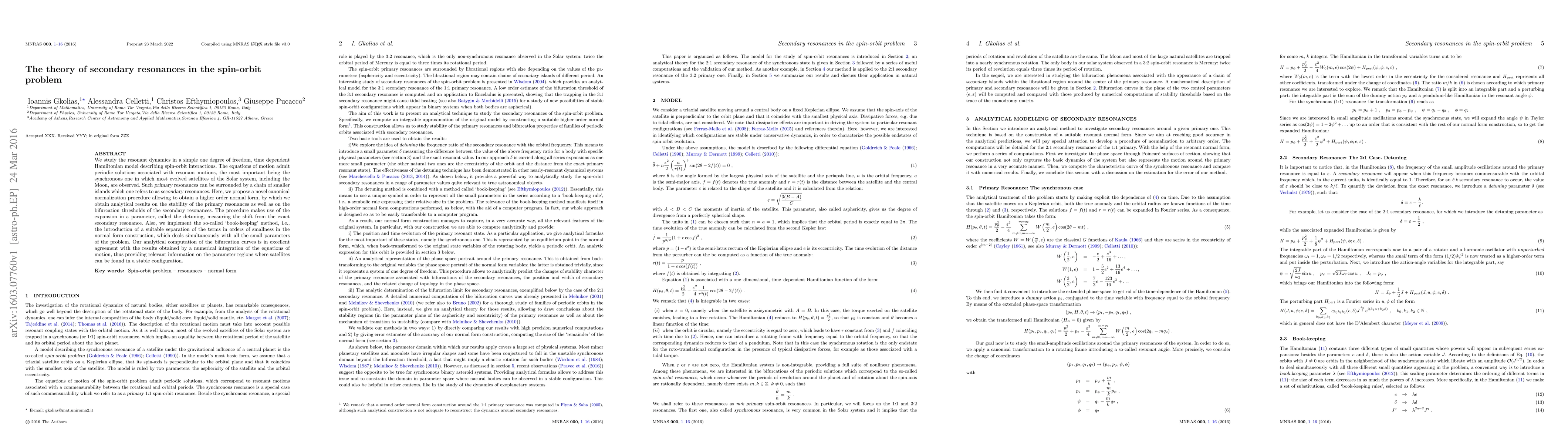 This paper investigates resonant dynamics in a spin-orbit problem using a novel canonical normalization procedure to obtain higher-order normal forms, revealing analytical stability of primary resonances and bifurcation thresholds of secondary resonances. The analytical results match numerical simulations, providing insights into stable satellite configurations.