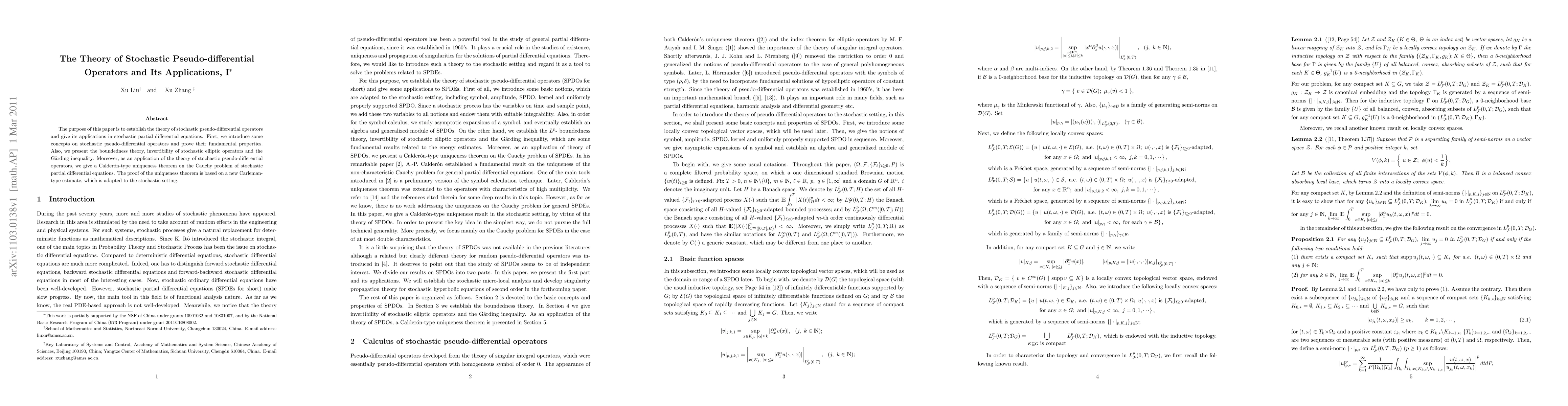 The purpose of this paper is to establish the theory of stochastic pseudo-differential operators and give its applications in stochastic partial differential equations. First, we introduce some concepts on stochastic pseudo-differential operators and prove their fundamental properties. Also, we present the boundedness theory, invertibility of stochastic elliptic operators and the Garding inequality. Moreover, as an application of the theory of stochastic pseudo-differential operators, we give a Calderon-type uniqueness theorem on the Cauchy problem of stochastic partial differential equations. The proof of the uniqueness theorem is based on a new Carleman-type estimate, which is adapted to the stochastic setting.
