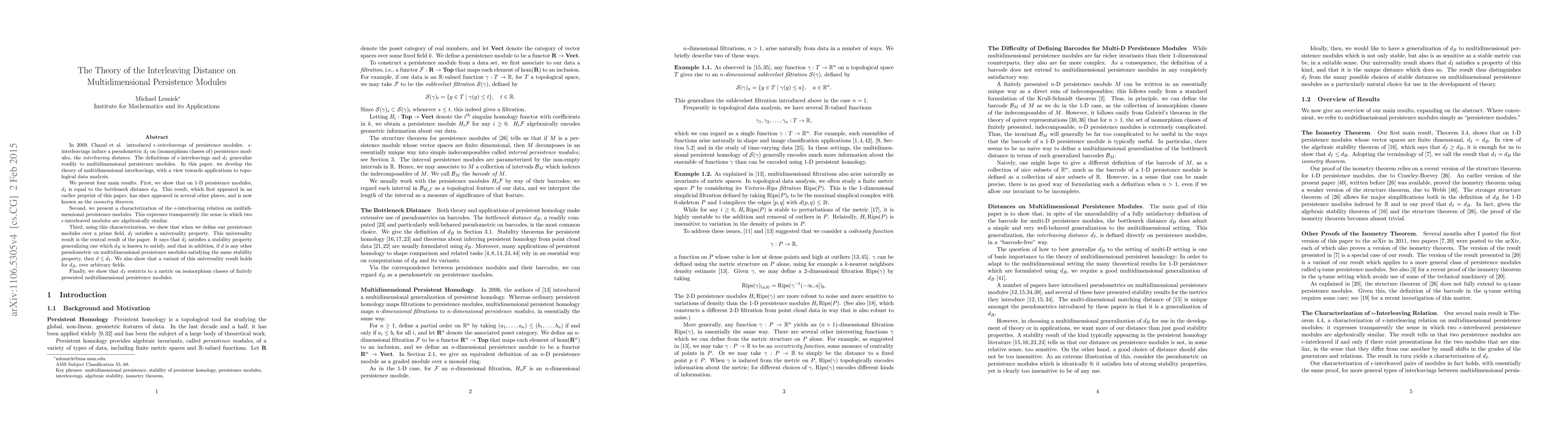 This paper develops the theory of interleaving distances on multidimensional persistence modules, showing that $d_I$ equals the bottleneck distance $d_B$ for 1-D modules and presenting a characterization of $\epsilon$-interleavings for multidimensional modules. The central result establishes the universality of $d_I$, asserting its stability and dominance over other pseudometrics.