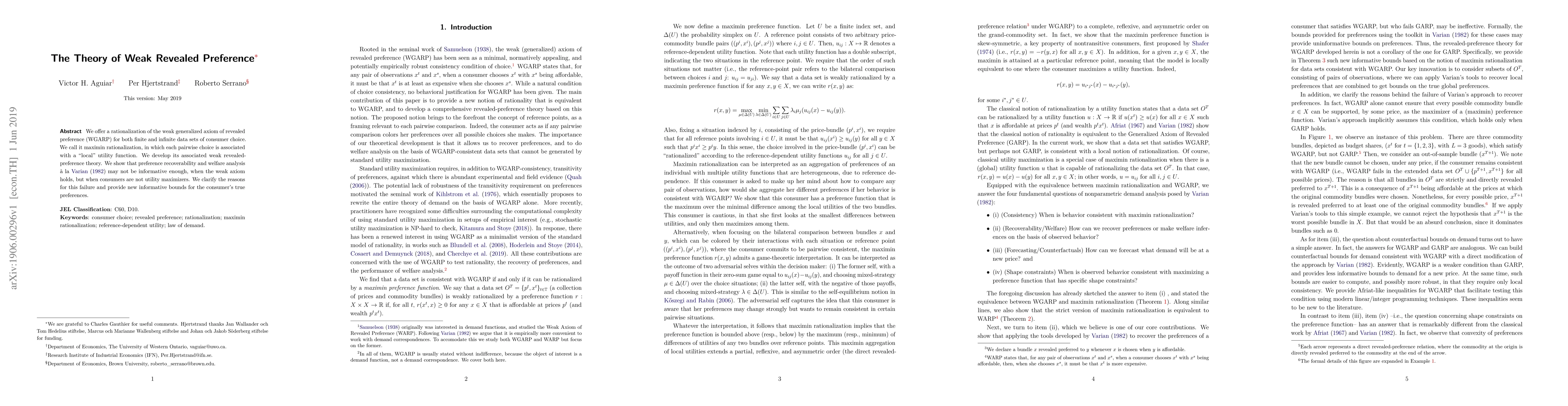 We offer a rationalization of the weak generalized axiom of revealed preference (WGARP) for both finite and infinite data sets of consumer choice. We call it maximin rationalization, in which each pairwise choice is associated with a "local" utility function. We develop its associated weak revealed-preference theory. We show that preference recoverability and welfare analysis \`a la Varian (1982) may not be informative enough, when the weak axiom holds, but when consumers are not utility maximizers. We clarify the reasons for this failure and provide new informative bounds for the consumer's true preferences.