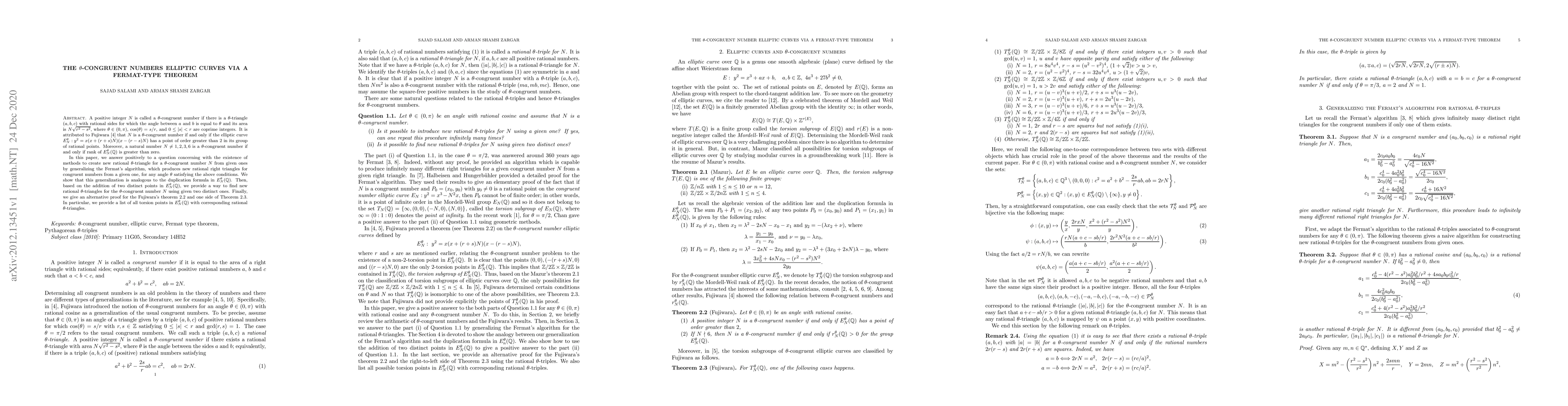 This paper explores $\theta$-congruent numbers and their associated elliptic curves, proving methods to generate new rational $\theta$-triangles from existing ones by generalizing Fermat's algorithm. It provides an alternative proof for Fujiwara's theorem and lists all torsion points on the corresponding elliptic curve with their associated rational triangles.