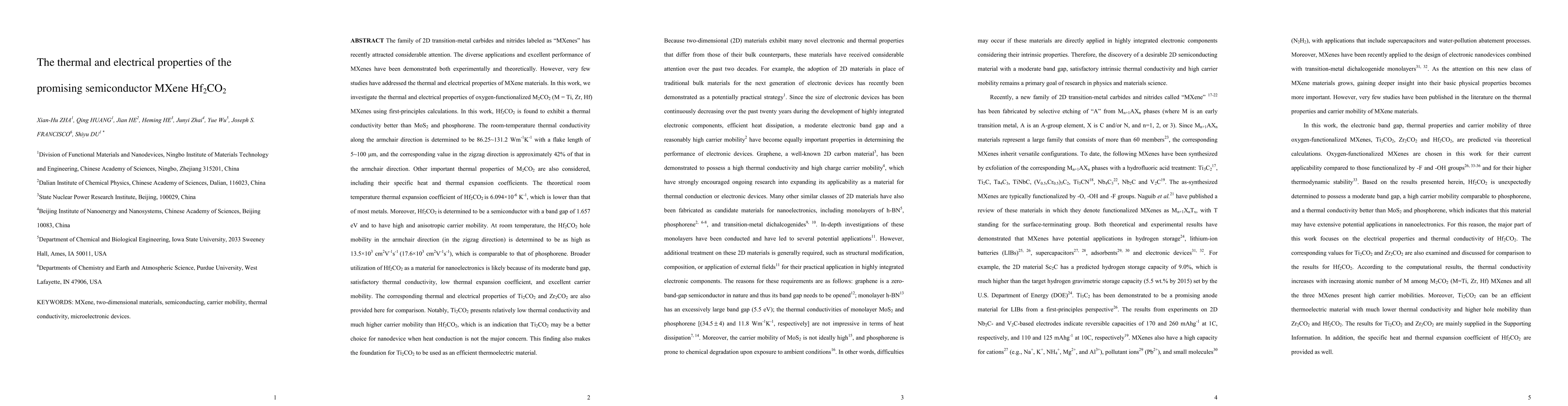 This study investigates the thermal and electrical properties of Hf2CO2 MXene, revealing superior thermal conductivity and high carrier mobility, making it a promising semiconductor for nanoelectronics. Comparative analysis with Ti2CO2 and Zr2CO2 suggests diverse applications based on their respective thermal and electrical characteristics.