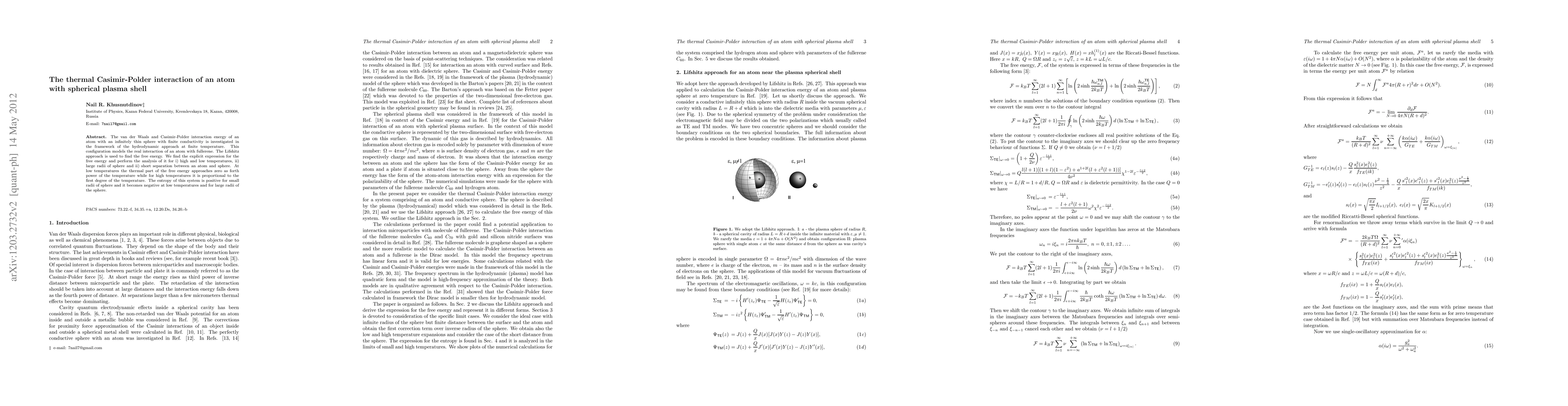 The van der Waals and Casimir-Polder interaction energy of an atom with an infinitely thin sphere with finite conductivity is investigated in the framework of the hydrodynamic approach at finite temperature. This configuration models the real interaction of an atom with fullerene. The Lifshitz approach is used to find the free energy. We find the explicit expression for the free energy and perform the analysis of it for i) high and low temperatures, ii) large radii of sphere and ii) short separation between an atom and sphere. At low temperatures the thermal part of the free energy approaches zero as forth power of the temperature while for high temperatures it is proportional to the first degree of the temperature. The entropy of this system is positive for small radii of sphere and it becomes negative at low temperatures and for large radii of the sphere.