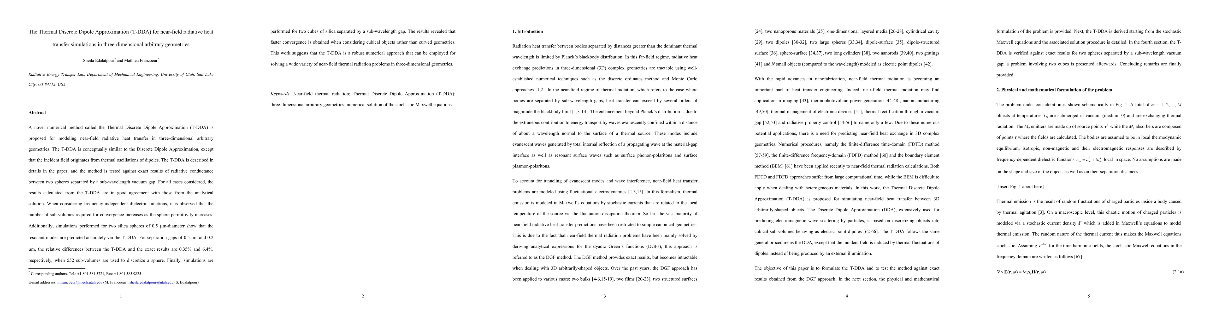 The paper introduces the Thermal Discrete Dipole Approximation (T-DDA) for simulating near-field radiative heat transfer in complex three-dimensional geometries. The T-DDA method shows good agreement with analytical solutions and accurately predicts resonant modes, demonstrating its robustness for solving thermal radiation problems.