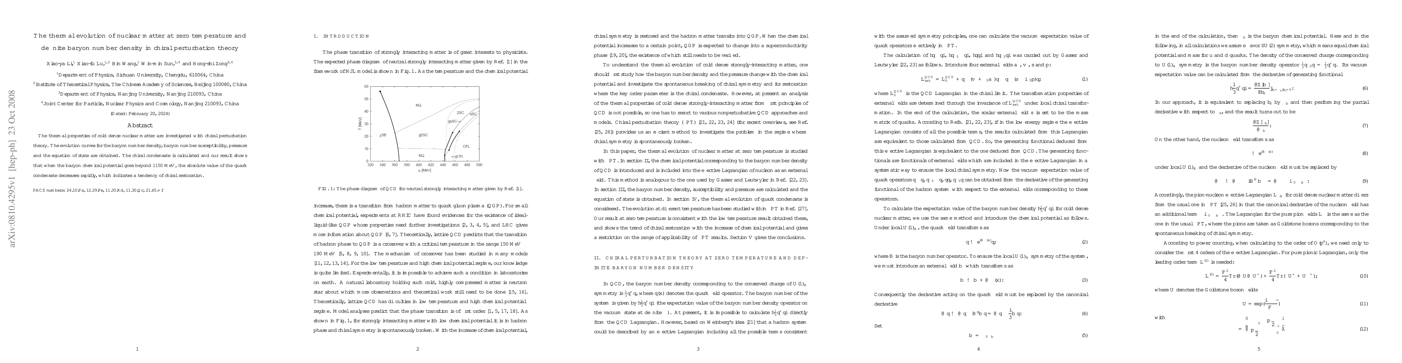 This paper investigates the thermal properties of cold, dense nuclear matter using chiral perturbation theory, revealing the evolution of baryon density, susceptibility, pressure, and the equation of state. It finds that beyond a baryon chemical potential of $1150 \mathrm{MeV}$, the quark condensate rapidly decreases, indicating chiral restoration.