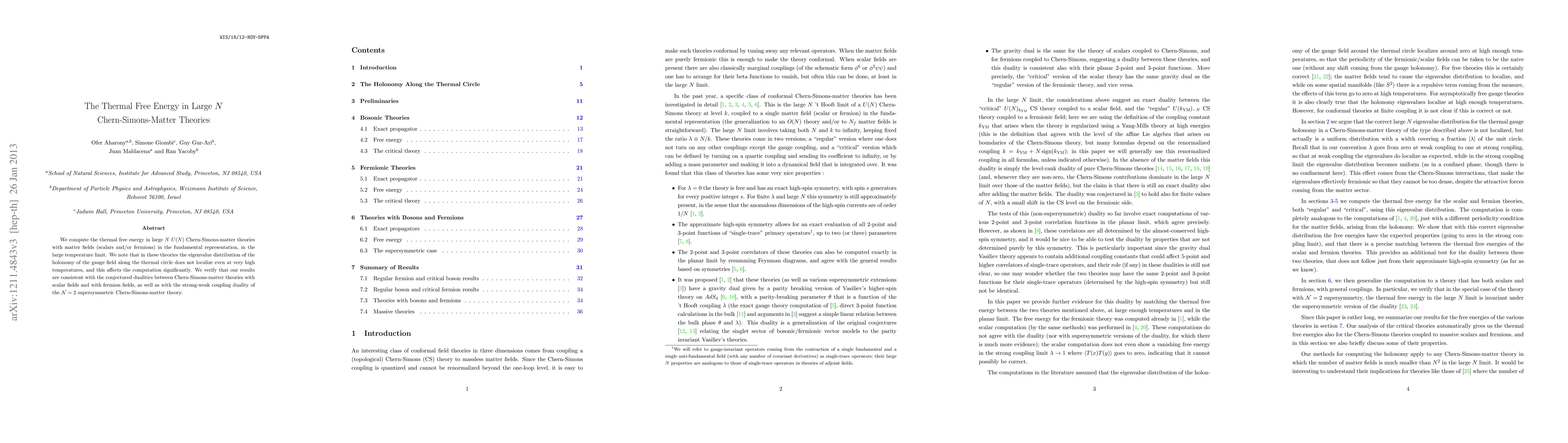 This paper calculates the thermal free energy in large N U(N) Chern-Simons-matter theories with scalar and fermion fields, revealing that high temperatures do not localize the gauge field holonomy. Results align with conjectured dualities and strong-weak coupling symmetries of the N=2 supersymmetric variant.