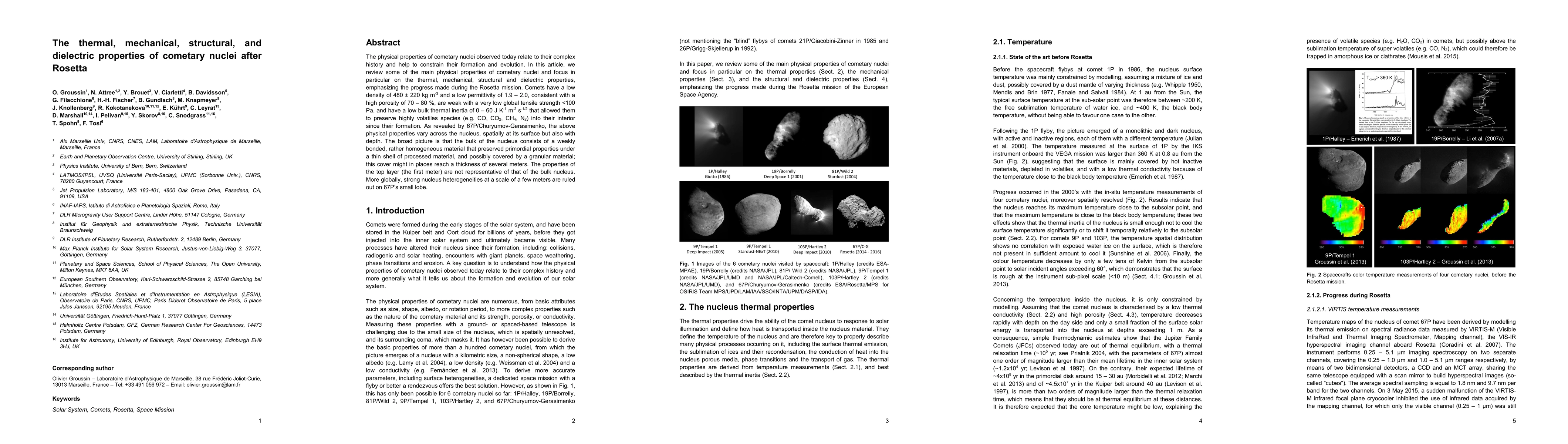 Cometary nuclei have low density, porosity, and thermal inertia, preserving volatile species from their formation. Their properties vary across the nucleus, with a bulk of weakly bonded material and a thin shell of processed material.