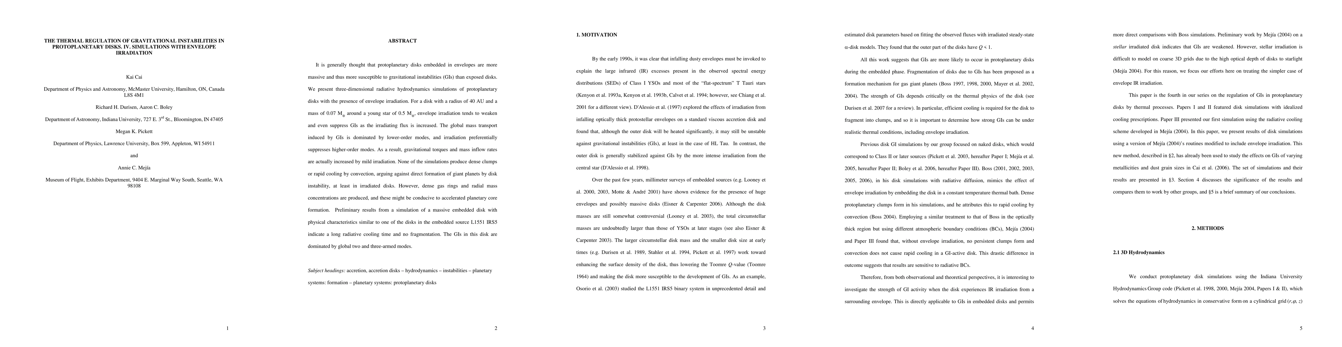 It is generally thought that protoplanetary disks embedded in envelopes are more massive and thus more susceptible to gravitational instabilities (GIs) than exposed disks. We present three-dimensional radiative hydrodynamics simulations of protoplanetary disks with the presence of envelope irradiation. For a disk with a radius of 40 AU and a mass of 0.07 Msun around a young star of 0.5 Msun, envelope irradiation tends to weaken and even suppress GIs as the irradiating flux is increased. The global mass transport induced by GIs is dominated by lower-order modes, and irradiation preferentially suppresses higher-order modes. As a result, gravitational torques and mass inflow rates are actually increased by mild irradiation. None of the simulations produce dense clumps or rapid cooling by convection, arguing against direct formation of giant planets by disk instability, at least in irradiated disks. However, dense gas rings and radial mass concentrations are produced, and these might be conducive to accelerated planetary core formation. Preliminary results from a simulation of a massive embedded disk with physical characteristics similar to one of the disks in the embedded source L1551 IRS5 indicate a long radiative cooling time and no fragmentation. The GIs in this disk are dominated by global two and three-armed modes.