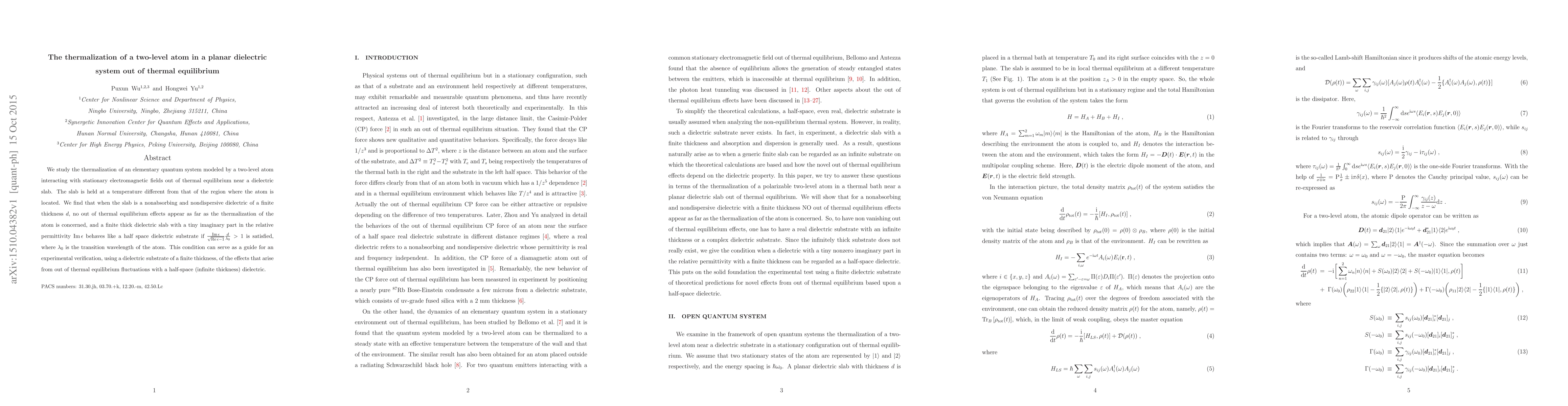 We study the thermalization of an elementary quantum system modeled by a two-level atom interacting with stationary electromagnetic fields out of thermal equilibrium near a dielectric slab. The slab is held at a temperature different from that of the region where the atom is located. We find that when the slab is a nonabsorbing and nondispersive dielectric of a finite thickness $ d$, no out of thermal equilibrium effects appear as far as the thermalization of the atom is concerned, and a finite thick dielectric slab with a tiny imaginary part in the relative permittivity $\operatorname{Im} \epsilon$ behaves like a half space dielectric substrate if $\frac{\operatorname{Im} \epsilon}{\sqrt{\operatorname{Re}\epsilon-1}} \frac{d}{\lambda_0} > 1$ is satisfied, where $\lambda_0$ is the transition wavelength of the atom. This condition can serve as a guide for an experimental verification, using a dielectric substrate of a finite thickness, of the effects that arise from out of thermal equilibrium fluctuations with a half-space (infinite thickness) dielectric.
