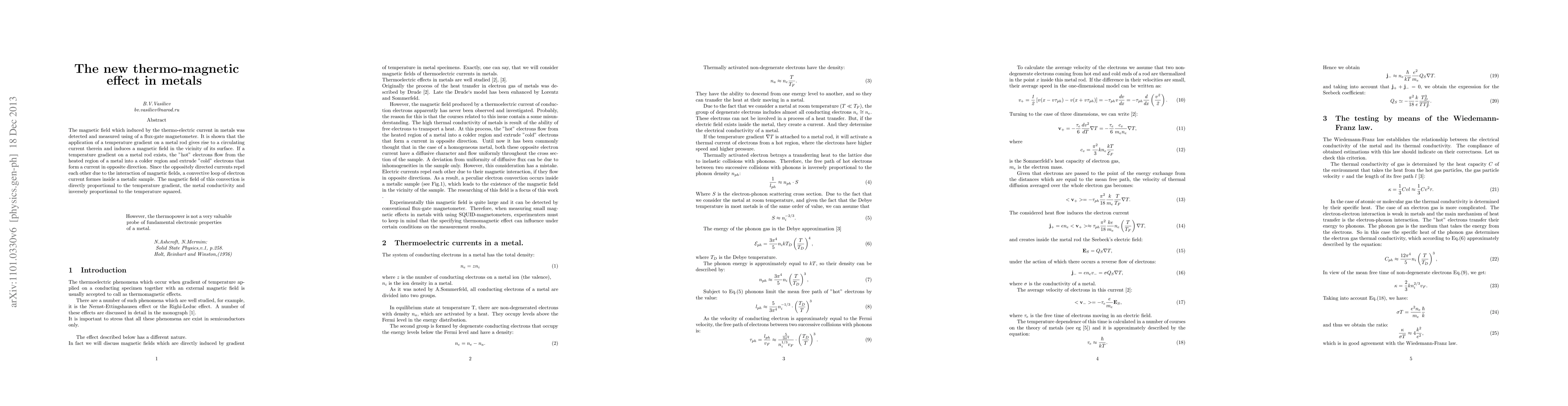 The magnetic field which induced by the thermo-electric current in metals was detected and measured using of a flux-gate magnetometer. It is shown that the application of a temperature gradient on a metal rod gives rise to a circulating current therein and induces a magnetic field in the vicinity of its surface. If a temperature gradient on a metal rod exists, the "hot"\ electrons flow from the heated region of a metal into a colder region and extrude "cold" electrons that form a current in opposite direction. Since the oppositely directed currents repel each other due to the interaction of magnetic fields, a convective loop of electron current formes inside a metalic sample. The magnetic field of this convection is directly proportional to the temperature gradient, the metal conductivity and inversely proportional to the temperature squared.