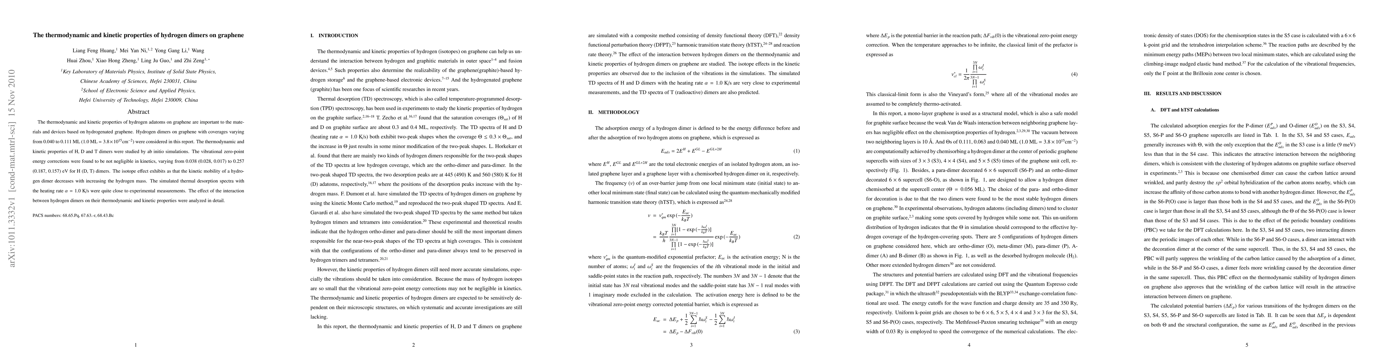 This study investigates the thermodynamic and kinetic properties of hydrogen dimers on graphene using ab initio simulations, revealing significant vibrational zero-point energy corrections and the influence of isotope effects on kinetic mobility. The findings align well with experimental thermal desorption spectra.