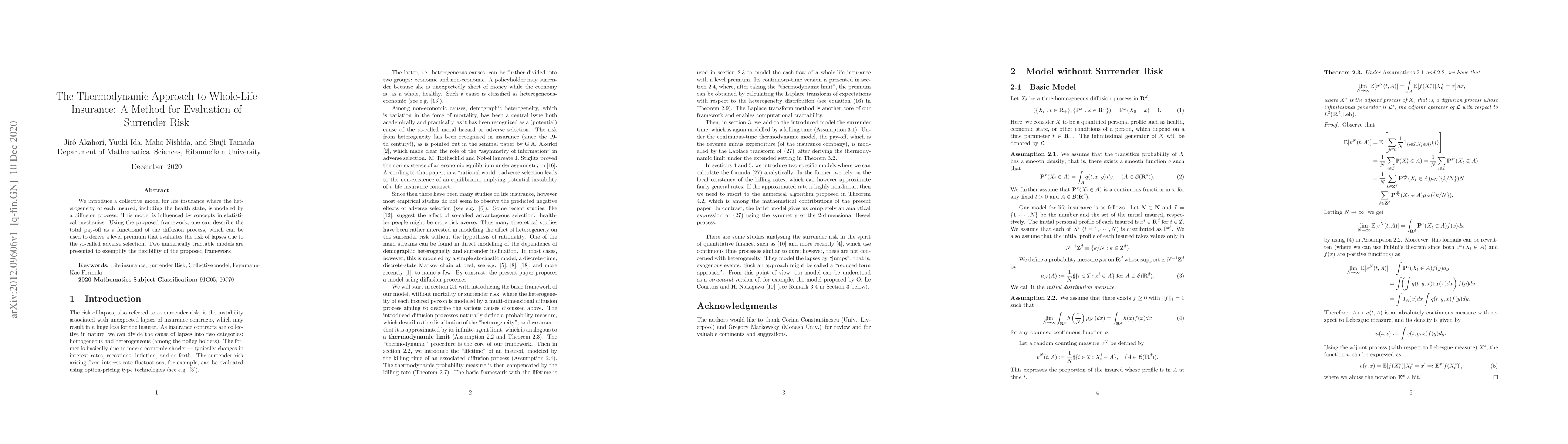 We introduce a collective model for life insurance where the heterogeneity of each insured, including the health state, is modeled by a diffusion process. This model is influenced by concepts in statistical mechanics. Using the proposed framework, one can describe the total pay-off as a functional of the diffusion process, which can be used to derive a level premium that evaluates the risk of lapses due tothe so-called adverse selection. Two numerically tractable models are presented to exemplify the flexibility of the proposed framework.