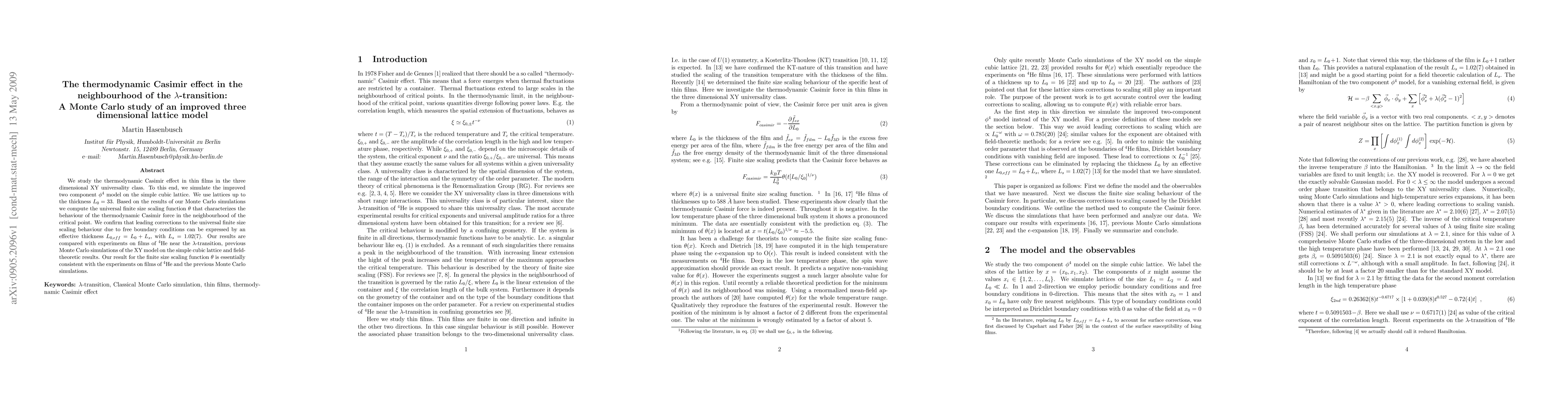 This paper investigates the thermodynamic Casimir effect in thin films near the critical point using Monte Carlo simulations of an improved three-dimensional XY model. The study confirms the effective thickness correction due to free boundary conditions and aligns with experimental results for films of 4He.