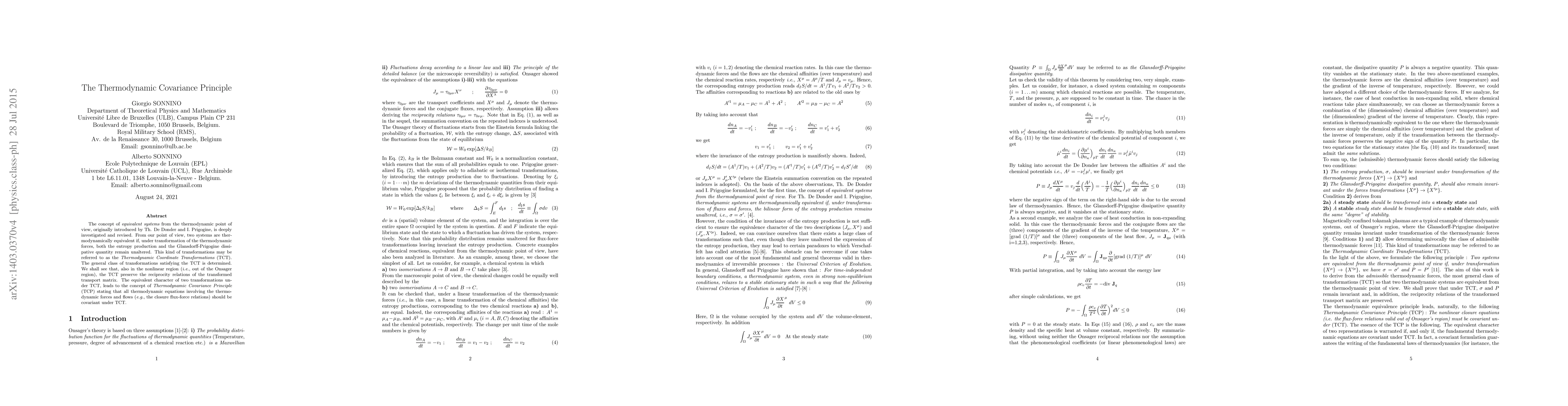 This paper revisits and revises the concept of 'equivalent systems' in thermodynamics. It introduces 'Thermodynamic Coordinate Transformations' (TCT), which keep entropy production and dissipative quantities unchanged. The research determines the general class of TCT, showing they preserve reciprocity relations even outside the Onsager region. The 'Thermodynamic Covariance Principle' (TCP) is proposed, asserting that thermodynamic equations involving forces and flows should remain unchanged under TCT.