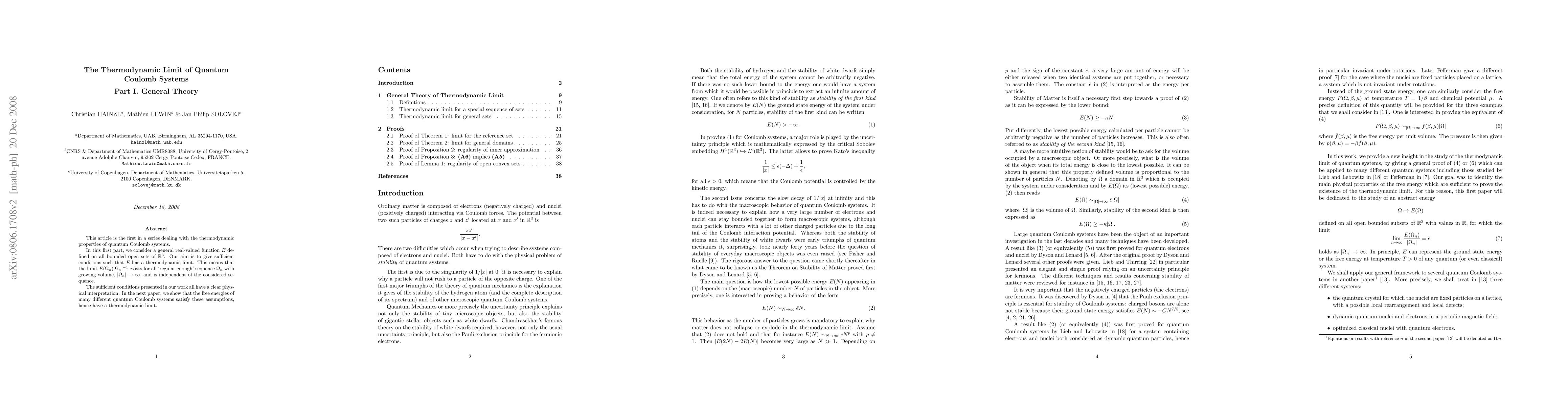 This paper establishes sufficient conditions for the thermodynamic limit of quantum Coulomb systems, ensuring that the limit exists and is independent of the chosen sequence of growing volumes. The conditions have clear physical interpretations, setting the stage for subsequent work showing their applicability to various quantum Coulomb systems.