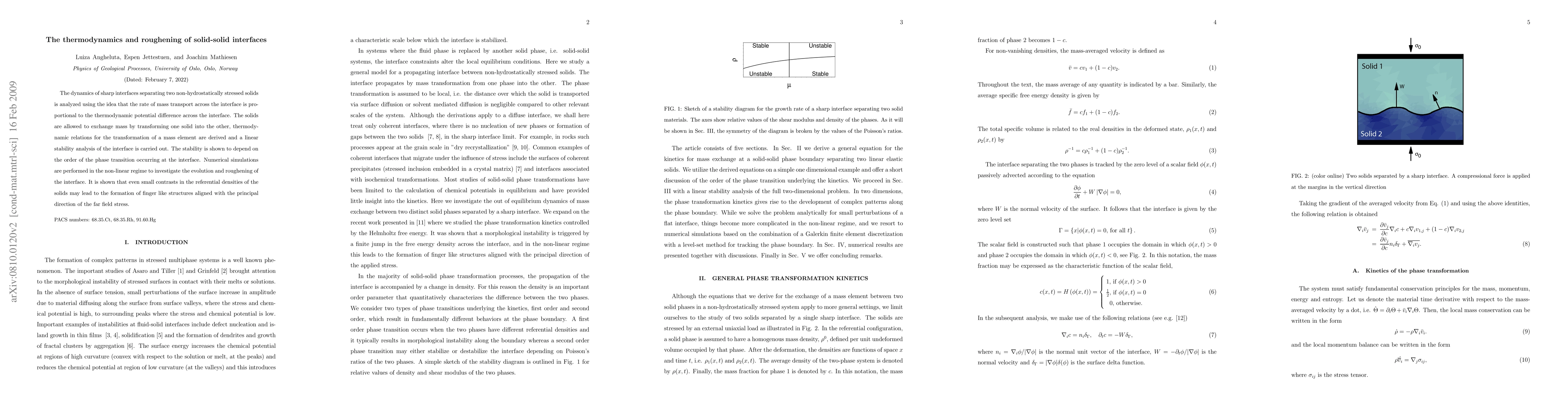 The dynamics of sharp interfaces separating two non-hydrostatically stressed solids is analyzed using the idea that the rate of mass transport across the interface is proportional to the thermodynamic potential difference across the interface. The solids are allowed to exchange mass by transforming one solid into the other, thermodynamic relations for the transformation of a mass element are derived and a linear stability analysis of the interface is carried out. The stability is shown to depend on the order of the phase transition occurring at the interface. Numerical simulations are performed in the non-linear regime to investigate the evolution and roughening of the interface. It is shown that even small contrasts in the referential densities of the solids may lead to the formation of finger like structures aligned with the principal direction of the far field stress.
