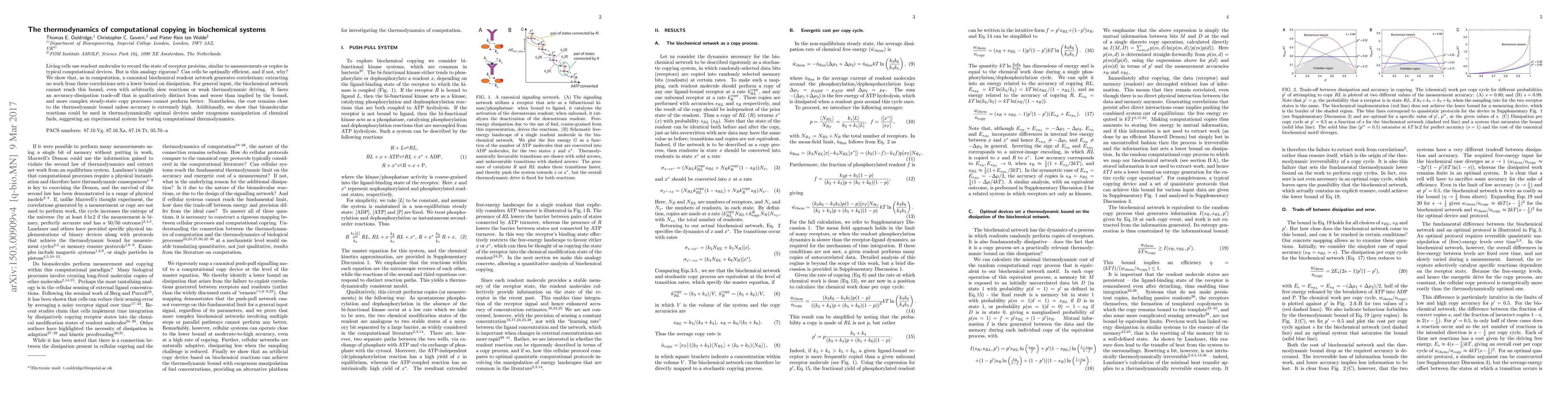 Living cells use readout molecules to record the state of receptor proteins, similar to measurements or copies in typical computational devices. But is this analogy rigorous? Can cells be optimally efficient, and if not, why? We show that, as in computation, a canonical biochemical readout network generates correlations; extracting no work from these correlations sets a lower bound on dissipation. For general input, the biochemical network cannot reach this bound, even with arbitrarily slow reactions or weak thermodynamic driving. It faces an accuracy-dissipation trade-off that is qualitatively distinct from and worse than implied by the bound, and more complex steady-state copy processes cannot perform better. Nonetheless, the cost remains close to the thermodynamic bound unless accuracy is extremely high. Additionally, we show that biomolecular reactions could be used in thermodynamically optimal devices under exogenous manipulation of chemical fuels, suggesting an experimental system for testing computational thermodynamics.