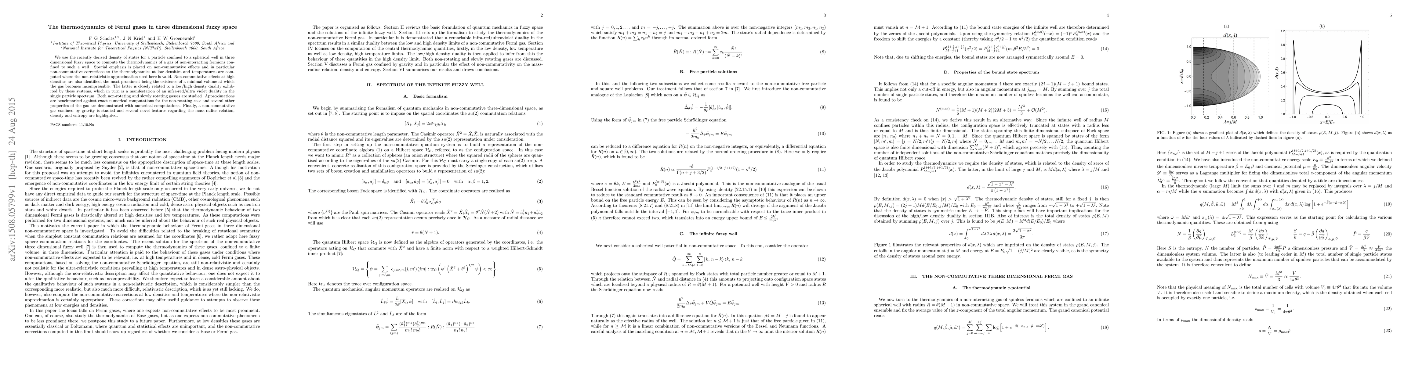 Researchers studied thermodynamics of fermions in a 3D fuzzy space, revealing non-commutative effects at low densities and temperatures, as well as an 'incompressible' state at high densities.