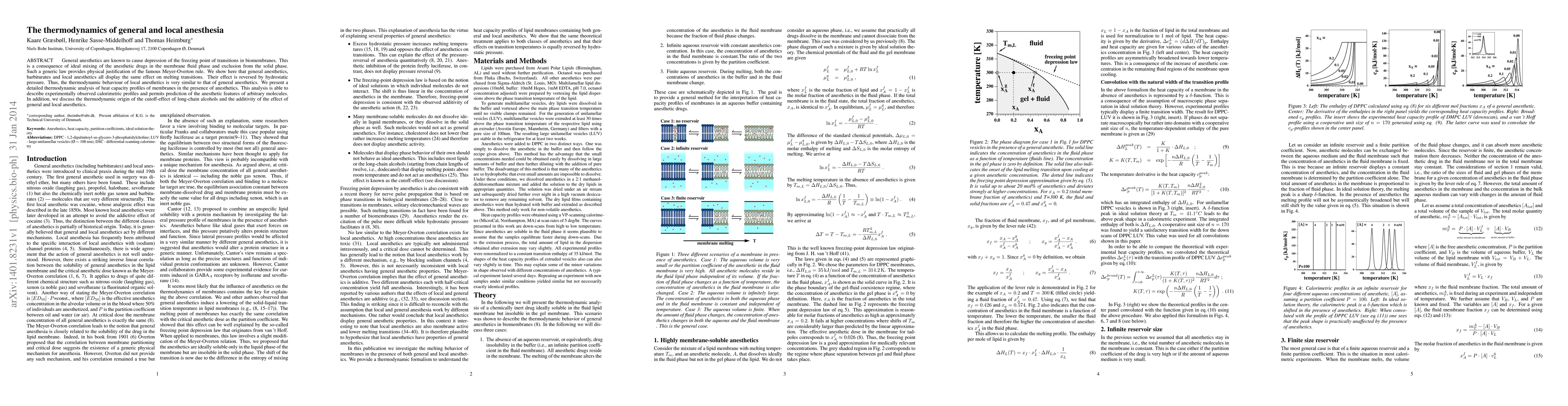 General anesthetics are known to cause depression of the freezing point of transitions in biomembranes. This is a consequence of ideal mixing of the anesthetic drugs in the membrane fluid phase and exclusion from the solid phase. Such a generic law provides physical justification of the famous Meyer-Overton rule. We show here that general anesthetics, barbiturates and local anesthetics all display the same effect on melting transitions. Their effect is reversed by hydrostatic pressure. Thus, the thermodynamic behavior of local anesthetics is very similar to that of general anesthetics. We present a detailed thermodynamic analysis of heat capacity profiles of membranes in the presence of anesthetics. This analysis is able to describe experimentally observed calorimetric profiles and permits prediction of the anesthetic features of arbitrary molecules. In addition, we discuss the thermodynamic origin of the cutoff-effect of long-chain alcohols and the additivity of the effect of general and local anesthetics.