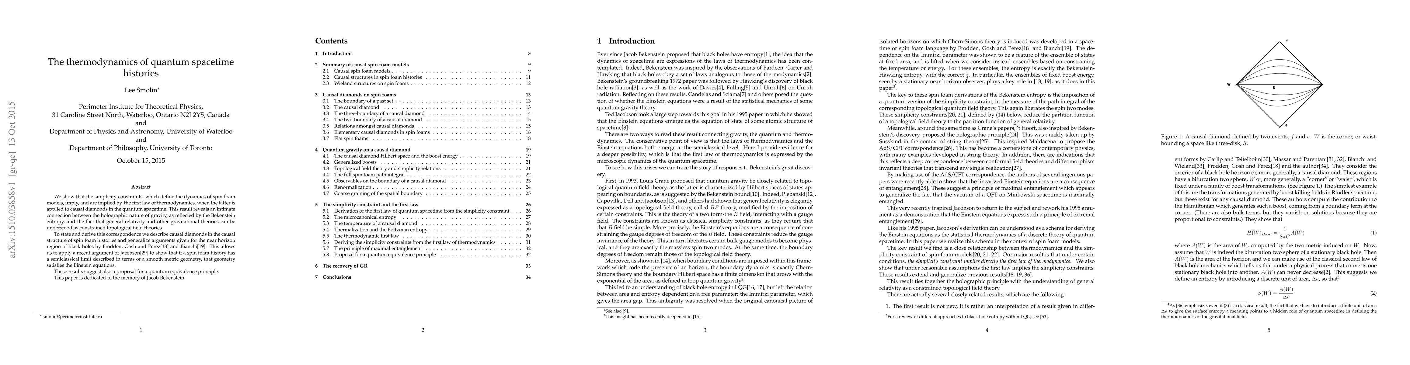 We show that the simplicity constraints, which define the dynamics of spin foam models, imply, and are implied by, the first law of thermodynamics, when the latter is applied to causal diamonds in the quantum spacetime. This result reveals an intimate connection between the holographic nature of gravity, as reflected by the Bekenstein entropy, and the fact that general relativity and other gravitational theories can be understood as constrained topological field theories. To state and derive this correspondence we describe causal diamonds in the causal structure of spin foam histories and generalize arguments given for the near horizon region of black holes by Frodden, Gosh and Perez and Bianchi. This allows us to apply a recent argument of Jacobson to show that if a spin foam history has a semiclassical limit described in terms of a smooth metric geometry, that geometry satisfies the Einstein equations. These results suggest also a proposal for a quantum equivalence principle.