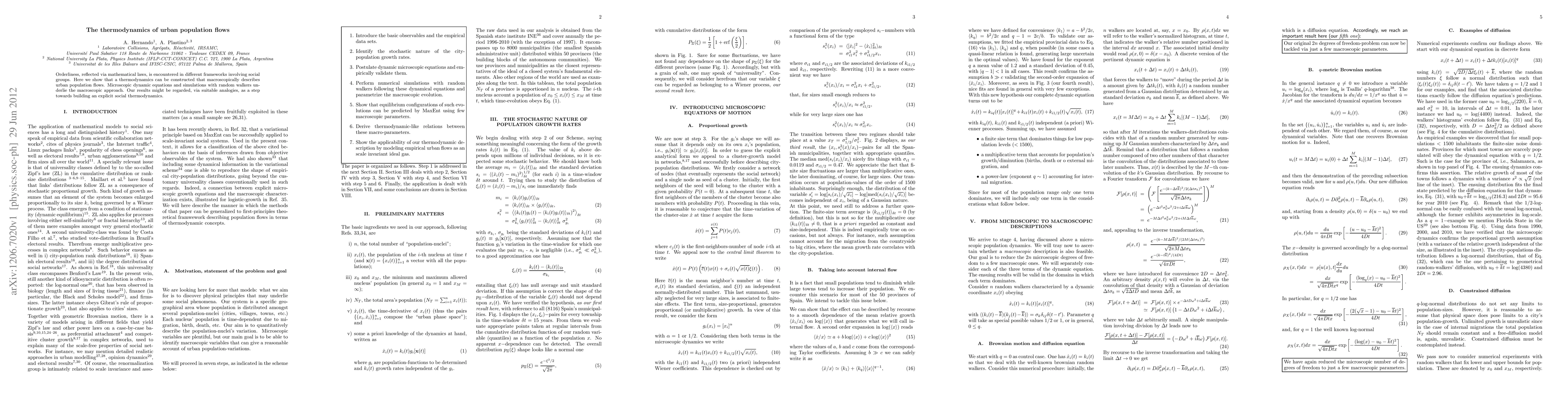Orderliness, reflected via mathematical laws, is encountered in different frameworks involving social groups. Here we show that a thermodynamics can be constructed that macroscopically describes urban population flows. Microscopic dynamic equations and simulations with random walkers underlie the macroscopic approach. Our results might be regarded, via suitable analogies, as a step towards building an explicit social thermodynamics.